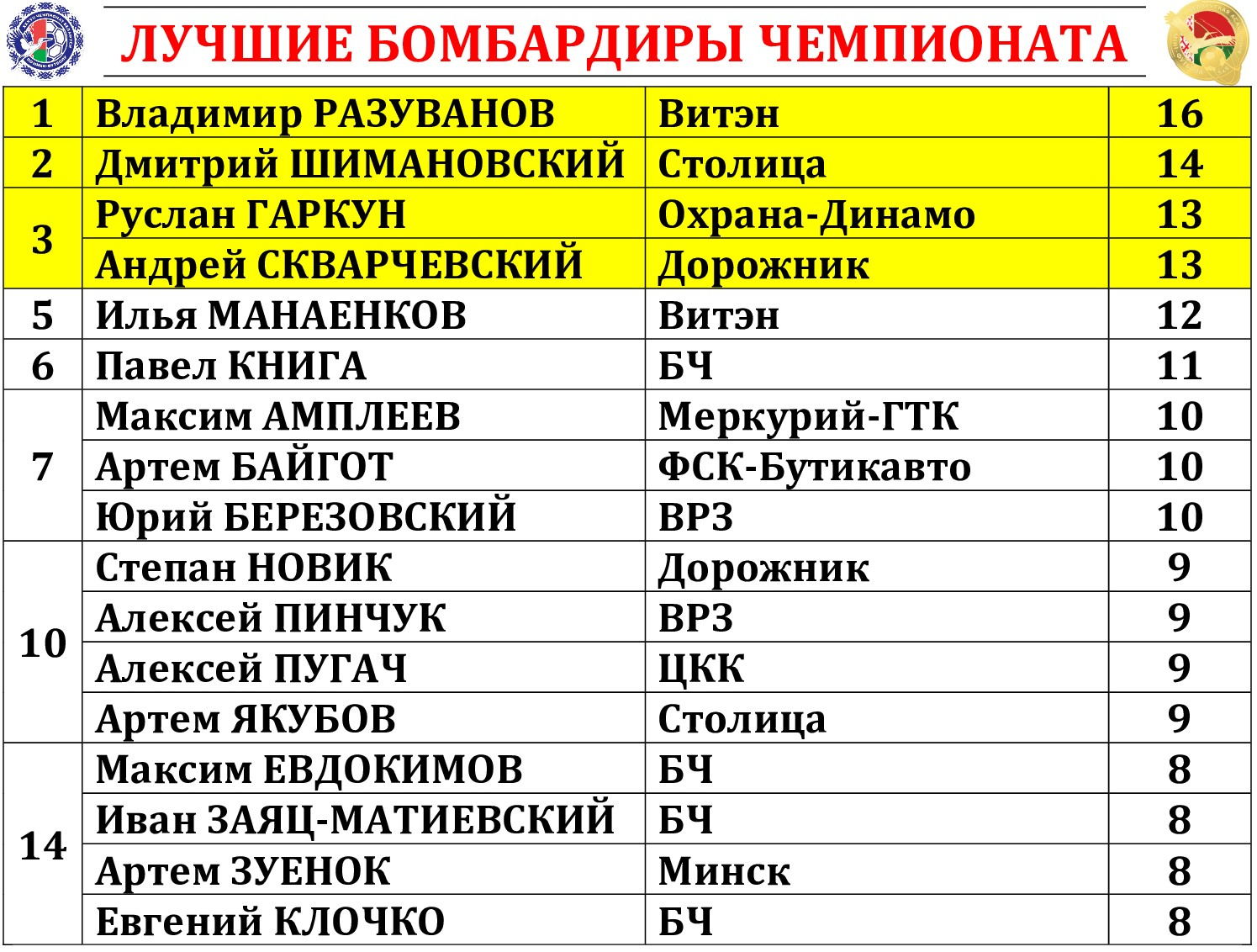 Денис ЛЕУ (Борисов-900); Дмитрий ШИМАНОВСКИЙ (Столица) – Виталий АФАНАСЬКОВ (БЧ) – Андрей СКАВАРЧЕВСКИЙ (Дорожник) – Максим ОСИПОВ (Меркурий-ГТК)