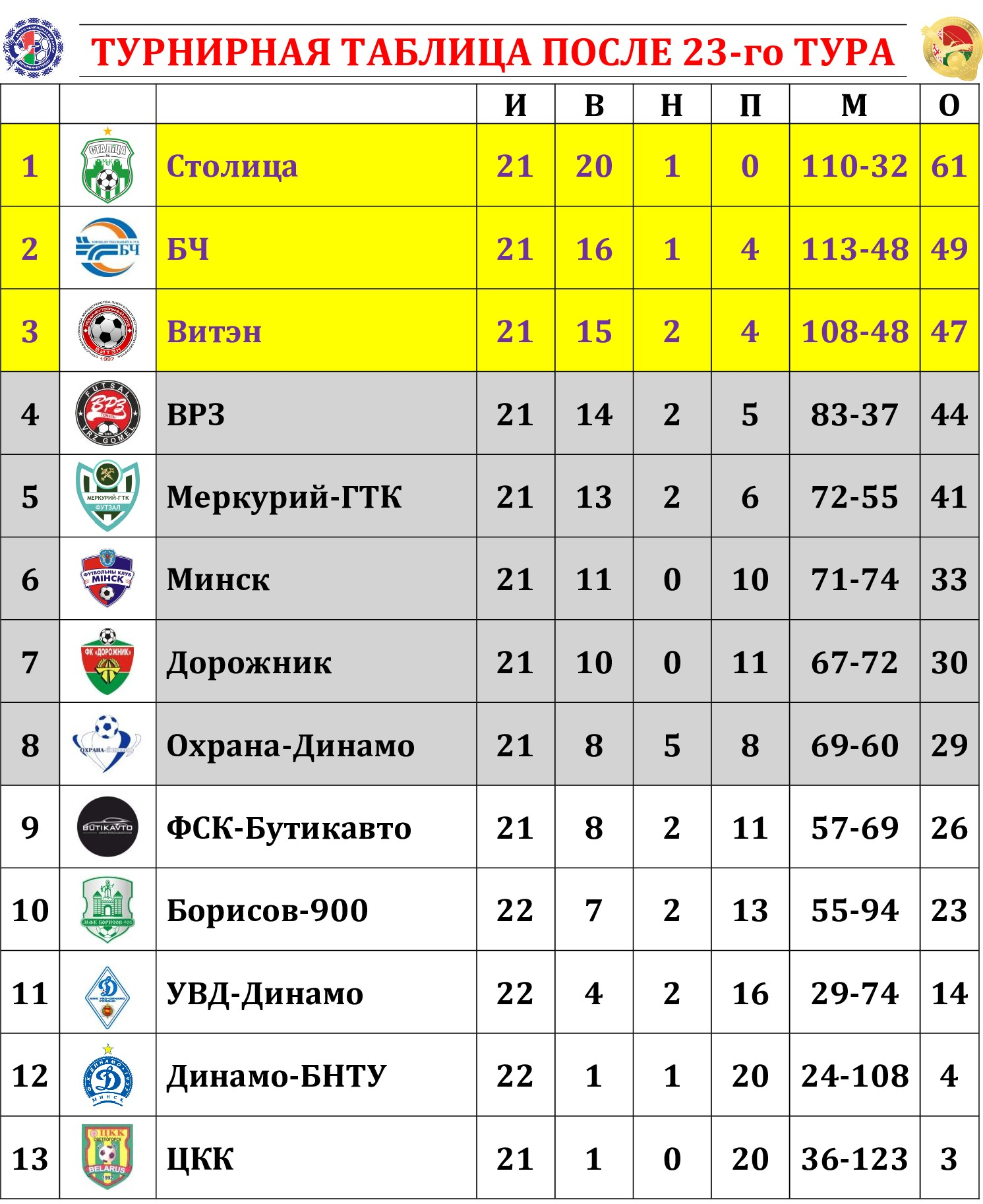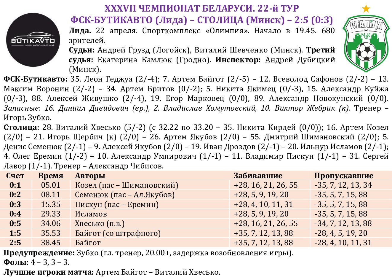 Честолюбивый лидский клуб при просто потрясающей зрительской поддержке не сумел разжиться очками в матче с решившей локальные задачи «Столицей» и существенно уменьшил свои шансы на попадание в плей-офф. «Столичники» также не остались без поддержки: несмотря на будний день и довольно позднее начало матча поболеть за любимую команду отправился весьма внушительный десант из Минска. Уже в первом тайме подопечные Александра Чибисова сделали ощутимую заявку на победу, трижды поразив ворота хозяев. Сначала Артем Козел искрометной ракетой прорвался по левой бровке и великолепно пробил с острого угла (забегая вперед, отметим, что именно его голевой удар признан самым красивым в 22-м туре), потом открыл счет своим голам за «Столицу» Денис Семенюк, получив прекрасную передачу от Алексея Якубова, ну а затем Володя Пискун направил мяч точно в «домик» российскому вратарю лидчан. После перерыва в своем фирменном стиле отличился Ильнур Исламов, передернувший соперника на бровке и сместившись затем в центр для удара. Пятое взятие ворот оформил ударом через всю площадку по пустым воротам Виталий Хвесько. Он стал 7-м вратарем «Столицы», забивавшим в чемпионатах. Лидируют Дмитрий Поляков – 8 голов, Алексей Лукша – 6 и Максим Трофимович – 4. В концовке убаюканные солидным преимуществом гости дважды пропустили. Главный забивала «ФСК-Бутикавто» Артем Байгот сначала шикарно исполнил штрафной, а затем наказал «столичников» за «обрезку». Но даже эти пропущенные мячи никоим образом не испортили в целом позитивное впечатление от игры «Столицы». Так держать! Идем дальше – на горизонте субботнее противостояние с «Минском». Спорткомплекс МАПИД, начало в 15.05.