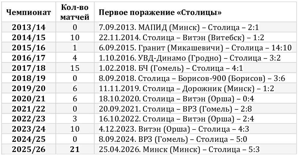 Без поражений не бывает побед. Рано или поздно первая осечка произошла бы. И, признаемся, наверное, хорошо – что сейчас. Полезно иногда опуститься с небес на землю. Эйфория по случаю досрочного выигрыша если и произошла, то проигрыш «Минску» должен дать отрезвляющий эффект. Понятно, что ничего страшного не произошло. Будем считать, просто не повезло. Это был не наш день. Сопернику победа была нужна куда больше, она гарантировала «Минску» попадание в плей-офф. Причем уже точно известно, что на четвертьфинальной стадии дружина Александра Черника не сыграет против команды Александра Чибисова. Возможно, этого не хотели оба коллектива. Жаль, что на отметке «21» завершилась беспрецедентная беспроигрышная серия «Столицы» со старта чемпионата. Ниже в таблице мы систематизировали данные о выступлениях нашей команды прежде. В графе «Кол-во матчей» указано, сколько игр без поражений она провела. До финиша «регулярки» – два тура. «Столица» сыграет с потерявшими шансы на участие в «майском безумии» светлогорским ЦКК (дома) и в гостях с «Борисовом-900». И очевидно, что наш соперник по первой стадии плей-офф определится буквально в последний день. Три варианта – минские «Дорожник» и «Охрана-Динамо», а также лидский «ФСК-Бутикавто». Что предпочтительнее?