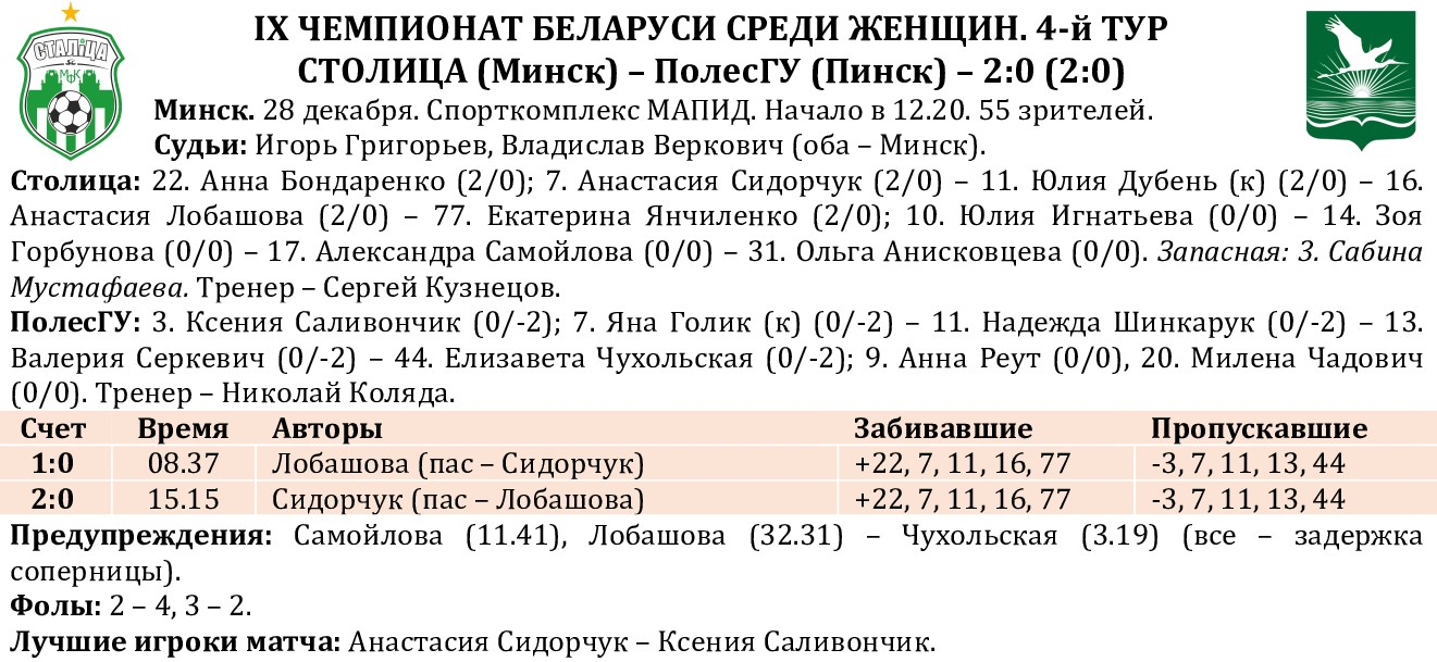Результаты остальных матчей 4-го тура: 27.12. БГУФК – ГрГУ им. Я.Купалы – 7:2 (1:1) (Капыша, 3, 25, 32, 37, Тихомирова, 31, Метельская, 32, Соколович, 40; Шидловская, 12, Вайнилович, 39). 29.12. Университет – Вортекс – 3:2 (1:0) (Касяник, 10, 31, Казакевич, 30; Тропникова, 25, Крылова, 35).