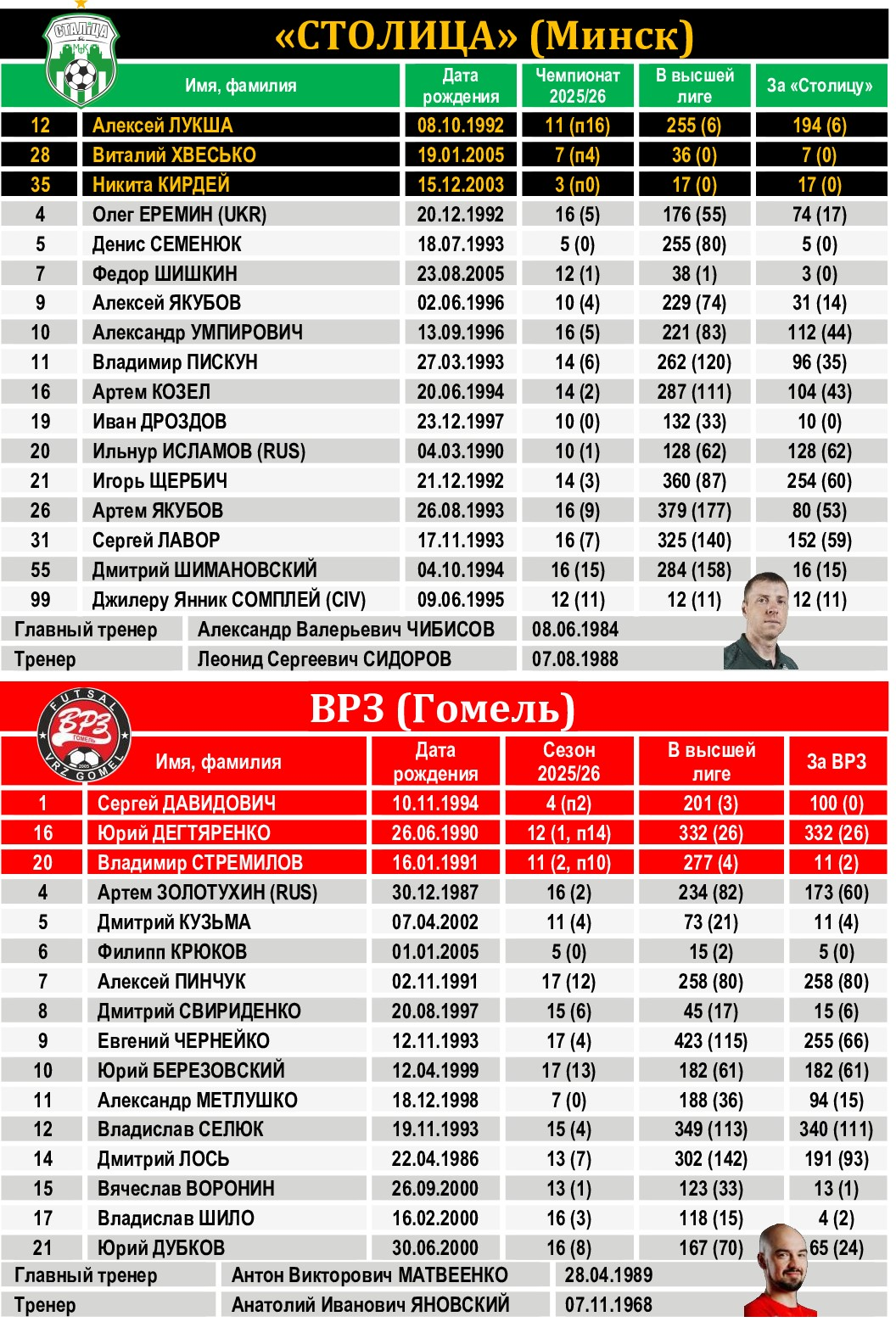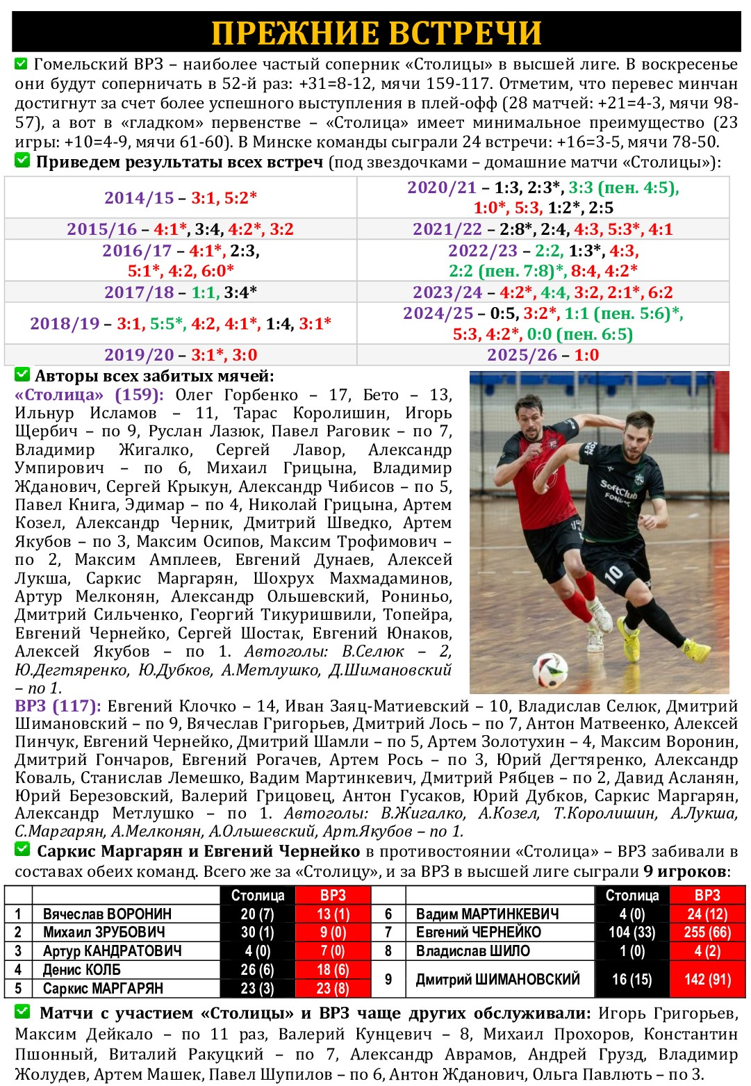 В прежние годы вывеска «Столица» – ВРЗ, пять раз встречавшаяся в финальных сериях плей-офф, вызывала неподдельный зрительский интерес и повышенный ажиотаж. И если минский клуб продолжает соответствовать чемпионским амбициям, то гомельчане после восьмилетнего владения серебряными медалями в прошлом сезоне заняли только четвертое место. И в нынешнем находятся за пределами призовой тройки, сражаясь за более высокую рейтинговую позицию с брестским «Меркурием-ГТК». Сейчас в составе «вагоностроителей» остался лишь один легионер – украинец Артем Золотухин, другой иностранец – россиянин Артем Бритов – в межкруговой паузе пополнил ряды лидского «ФСК-Бутикавто». Поединок первого круга, прошедший 11 октября в гомельском «Локомотиве», принес гостям минимальную викторию – 1:0. Единственный мяч на 29-й минуте забил Александр Умпирович. В турнирной таблице сейчас команды разделяют 11 очков, причем у «столичников» есть еще игра в запасе. Матч 19-го тура пройдет в воскресенье, 22 марта, во Дворце спорта «Уручье». Начало – в 13.00. Прямая трансляция – на телеканале «Беларусь 5». Дружина Антона Матвеенко не сможет рассчитывать на Дмитрия Свириденко, пропускающего игру из-за полученных трех желтых карточек. После ВРЗ «Столица» 20-й тур пропустит, получив без игры 3 очка за техническую победу над снявшимся с чемпионата «Динамо-БНТУ». А затем – встреча с действующим чемпионом страны «Витэном».