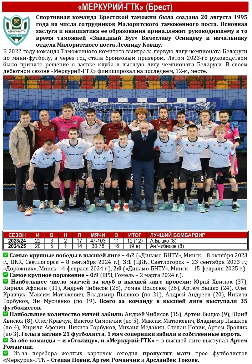 Во втором круге «Столица» только однажды покидала пределы Минска, сделав недалекую вылазку в Борисов. А вот на финише «регулярки» ей предстоит за шесть дней посетить Малориту (от Дворца спорта «Уручье» – 380 км) и Светлогорск (224 км). Малорита, где на этот раз проводит свой домашний поединок брестский «Меркурий-ГТК» («родной» для «таможенников» ДС «Виктория» занят подготовкой арены к предстоящему концерту Сергея Лазарева) станет для «столичников» 19-й «точкой» на карте, где они проведут матч чемпионата страны. Дружина Алексея Наливайко в плей-офф ни при каком раскладе не попадает, занимая 9-ю позицию. Прежде она со «столичниками» ни в Кубке, ни в чемпионате за очки зацепиться не сумела (8 поражений), однако сейчас команда вернулась на «малую родину». Ведь именно с Малоритского таможенного поста в августе 1995 года и началась история клуба. Да и основатель его – Леонид Петрович Ковш – является уроженцем этого города. И пусть звезд с небес «таможенники» не достают, но, обыграв дома «Витэн» (3:2), интригу в чемпионат внесли! Правда, в субботу им придется играть без трех нахватавших карточек игроков основы – Степана Новика, Артема Романчика и Арсланбека Токоева. Но и у Александра Чибисова лазарет полон, восстановить бы кого к гонке на выбывание!