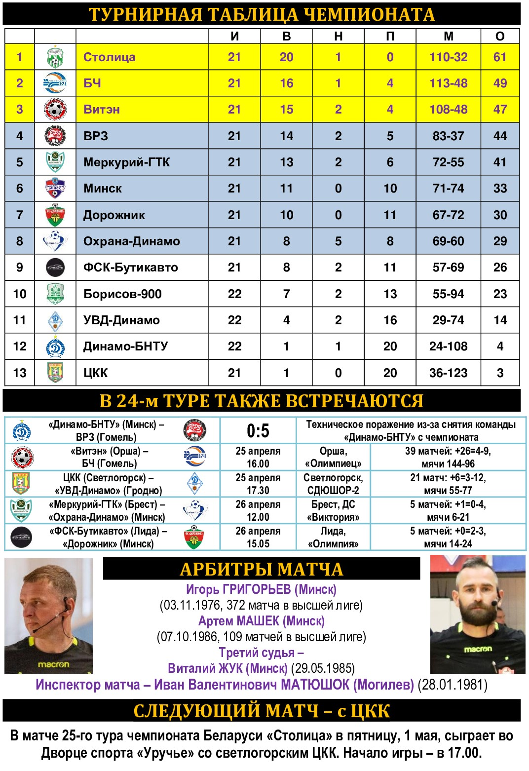 Всего три тура остается провести командам на турнирной дистанции регулярного чемпионата. Его победитель уже известен. Приятно в очередной раз напомнить, что досрочно, за 4 игры до промежуточного финиша им стала «Столица». Известно также, что 11-е место при любом раскладе у «УВД-Динамо», а вот за остальные места, в том числе в зоне плей-офф, борьба ожидается нешуточная. Участие в «майском безумии» обеспечили себе только пять команд: добавляем БЧ, «Витэн», ВРЗ и «Меркурий-ГТК». На оставшиеся три позиции претендуют 4 коллектива: «Минск», «Дорожник», «Охрана-Динамо» и «ФСК-Бутикавто». Вот потому-то грядущее минское дерби имеет куда большее значение для дружины Александра Черника, нежели Александра Чибисова. У «горожан» потом матчи с «соседями» по спорткомплексу МАПИД – «Охраной» и «Дорожником». Впрочем, осечки конкурентов (в первую очередь, Лиды) могут облегчить «Минску» выполнение задачи. Вероятность участия клуба в плей-офф – процентов 90. Однако на данном этапе это максимум, что можно выжать из команды. Потеря в межсезонье почти десятка футболистов и набор вместо них новых вывели «горожан» из числа претендентов на медали, но матчи со «Столицей» – это уже принципиальное соперничество, в котором легко никому не будет. «Минск» в 7 последних матчах записал в свой актив 6 викторий, «Столица» же и вовсе в этом чемпионате никому не проигрывала, одержав 14 побед подряд (а с учетом Кубка – 19!). Найдет коса на камень?! Из-за перебора желтых карточек не сыграет за «Минск» Виталий Шадурко, а вот для Владимира Пискуна игра против бывшего клуба станет юбилейной, 100-й, в составе «Столицы». Резюмируем: мини-футбола много не бывает, третья игра за неделю. И посему приглашаем всех наших болельщиков посетить в субботу спорткомплекс МАПИД на Шаранговича, 20 и отдать свои эмоции любимой команде! Начало – в 15.05, прямая трансляция на «ЯСНАе TV». Болеем за наших! Важны – кожны!