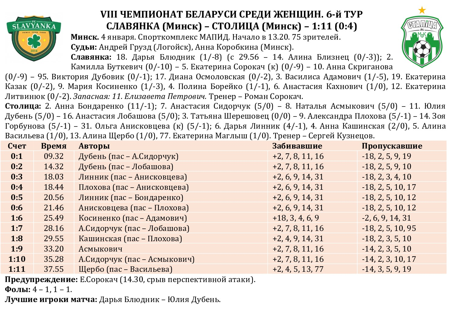 Первыми в новом году на паркет официальных соревнований вышли женщины, уже в первый уик-энд отыгравшие матчи 6-го тура национального первенства. Лидер чемпионата «Столица» встречался с землячками из «Славянки». Соперницы, несмотря на укрепление своих рядов вернувшимися на родину легионерками – Анной Скригановой из польской «Полонии» (Сьрода-Велькопольска) (Д2), Анастасией Кахнович – из польского «Влукняжа» (Д3), Дианой Осмоловской из российской «Рязани-ВДВ» и Камиллой Буткевич из казахстанского «Ордабасы», не сумели навязать серьезный бой «Столице» и потерпели сокрушительное поражение с крупным счетом 1:11. Подопечные Сергея Кузнецова одержали шестую викторию подряд (а с учетом прошлого чемпионата – 20-ю!), причем третью кряду с крупным счетом! В ближайшее воскресенье «Столица» в заключительном матче первого круга примет гродненский ГрГУ.