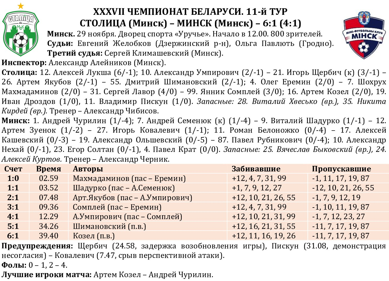 Результаты остальных матчей 11-го тура: 29.11. Охрана-Динамо – Меркурий-ГТК – 2:3 (1:2) (Кругленя, 9, Маградзе, 32; Осипов, 8, 20, Амплеев, 35). БЧ – Витэн – 3:5 (2:2) (Книга, 1, Шишов, 20, Соловьев, 37; Разуванов, 4, Синицкий, 5, Клочко, 26-с/в, Балдин, 28, Жигалко, 31). ВРЗ – Динамо-БНТУ – 7:0 (5:0) (Свириденко, 5, 13, 17, Березовский, 13, 19, 31, Пинчук, 39). УВД-Динамо – ЦКК – 2:0 (1:0) (М.Кириллов, 17, А.Новик, 40). 30.11. Дорожник – ФСК-Бутикавто – 6:5 (1:3) (Астафьев, 18, 26, Якимец, 28-с/в, Арешков, 29, Осмоловский, 31, Грицук, 34; Кандратович, 13, Новокунский, 13, А.Байгот, 16, Куйжа, 21, 26).