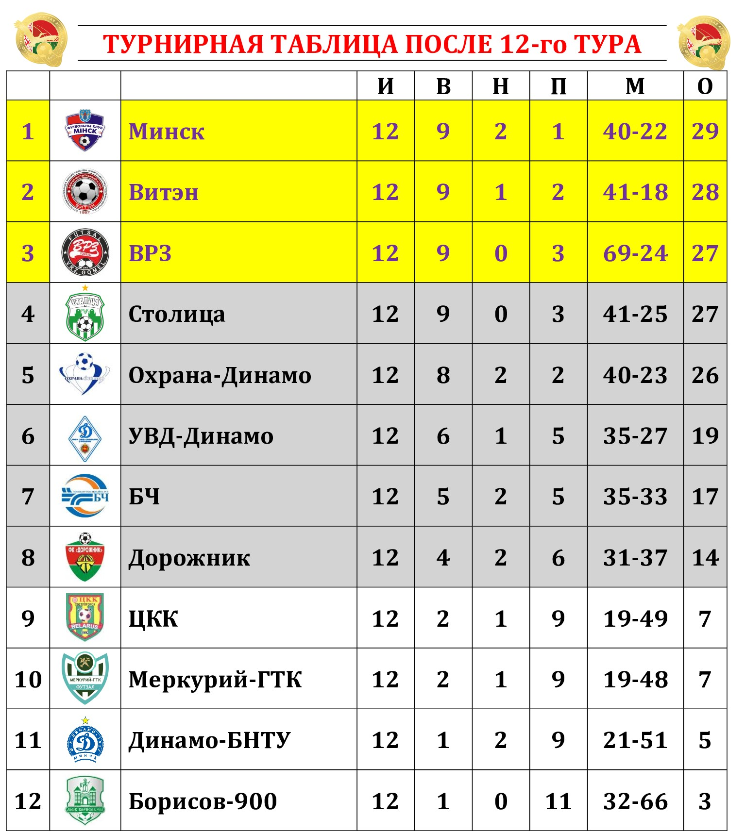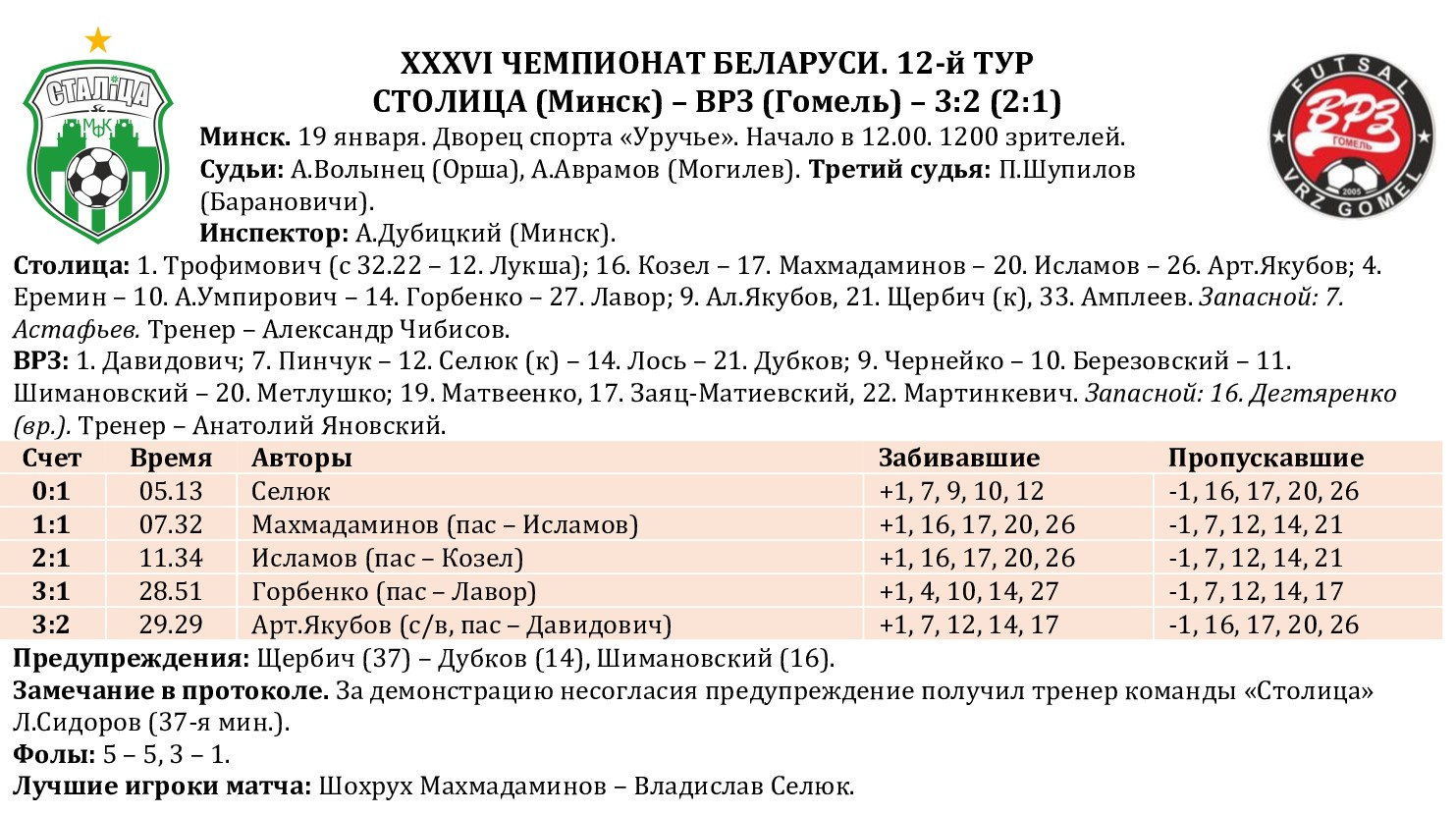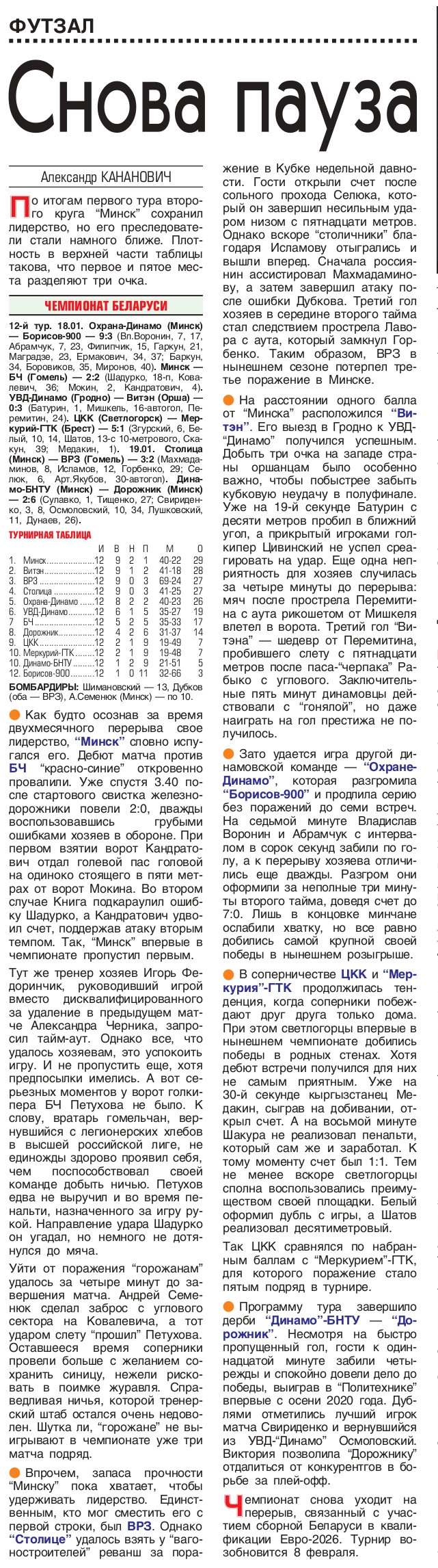 Продолжаем традицию подводить статистические итоги прошедших туров чемпионата страны. На очереди – первый в новом году и после межкруговой паузы 12-й тур. На сайте МФК «Столица» публикуем полную статистику состоявшихся матчей с указанием авторов голевых передач и данных по системе «плюс/минус», видеообзоры, а также символическую сборную, лучшего игрока, список лидеров среди бомбардиров, снайперов по системе «гол + пас», лучших по системе «плюс/минус», материалы прессы, подборку лучших голов тура. Вся информация о прошедшем туре собрана под одним заголовком в одном месте!