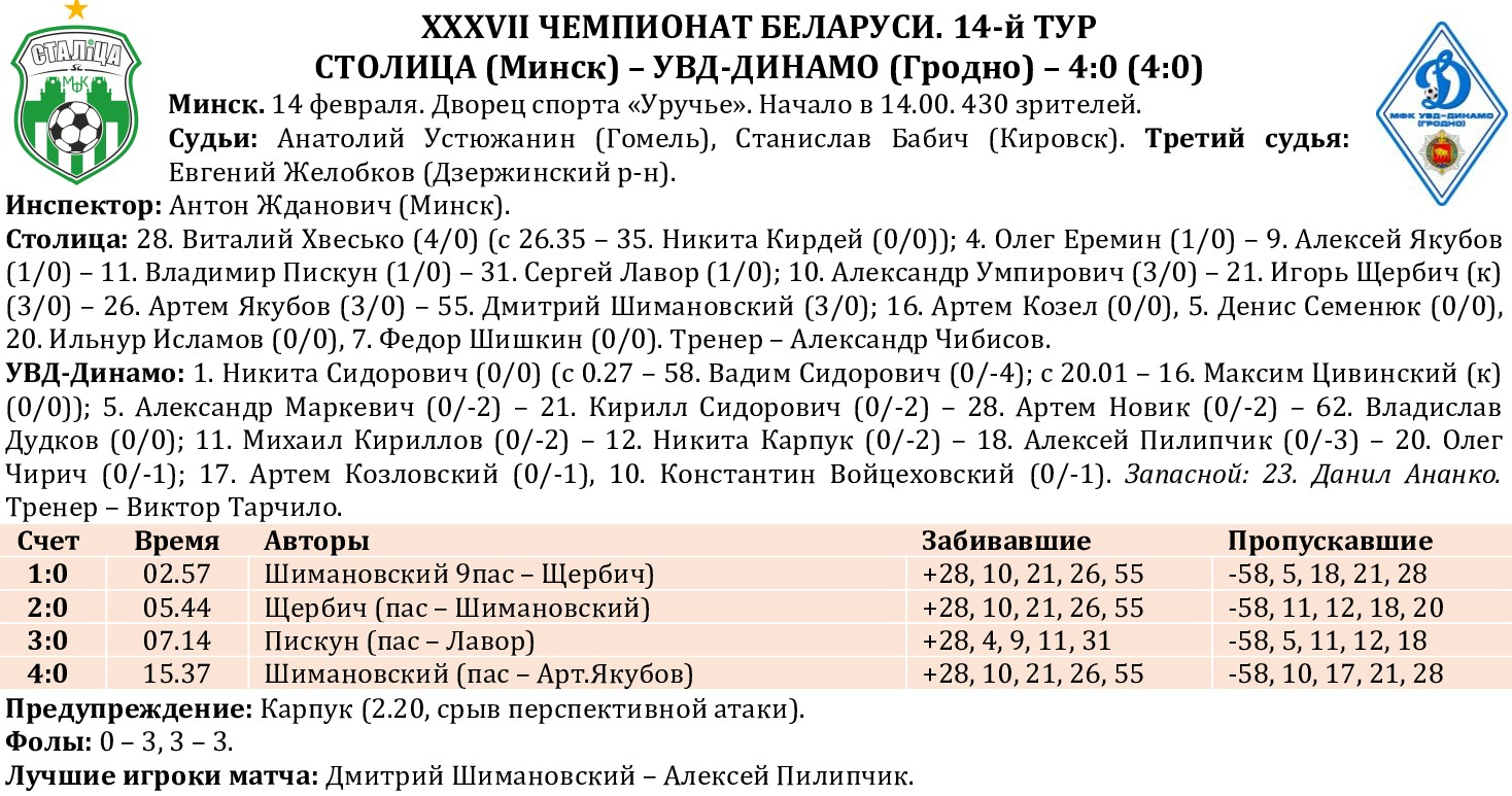 Результаты остальных матчей 14-го тура: 13.02. Дорожник – ЦКК – 8:1 (2:0) (С.Новик, 5, 12, Скварчевский, 22, 33, 33, Гуминский, 25, Астафьев, 26, Лушковский, 37; А.Майсеенко, 38). 14.02. Охрана-Динамо – Борисов-900 – 1:1 (1:0) (Барсуков, 12; Филипчик, 39-с/в). ВРЗ – Меркурий-ГТК – 0:1 (0:0) (Осипов, 39). Динамо-БНТУ – ФСК-Бутикавто – 0:5 (техн. поражение). 15.02. БЧ – Минск – 10:1 (6:0) (Евдокимов, 6, Афанаськов, 9, 33, Шадурко, 11-с/в, Новский, 14, Книга, 14, Заяц-Матиевский, 16, 40, Клочко, 29, Мокин, 37; Шадурко, 34).