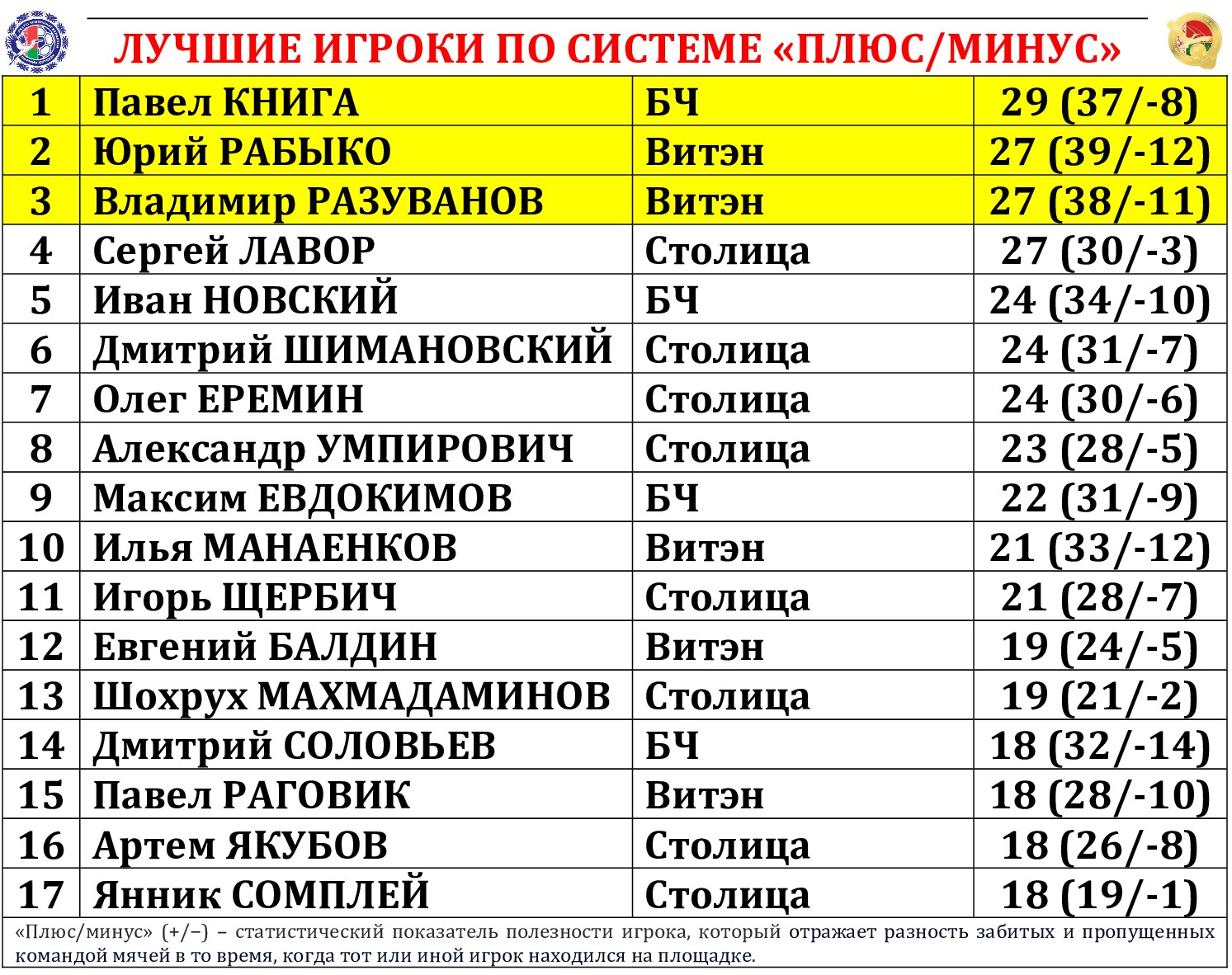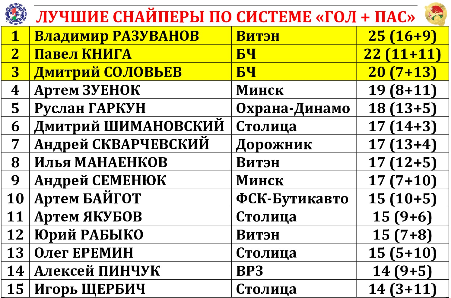 Денис ЛЕУ (Борисов-900); Дмитрий ШИМАНОВСКИЙ (Столица) – Виталий АФАНАСЬКОВ (БЧ) – Андрей СКВАРЧЕВСКИЙ (Дорожник) – Максим ОСИПОВ (Меркурий-ГТК)