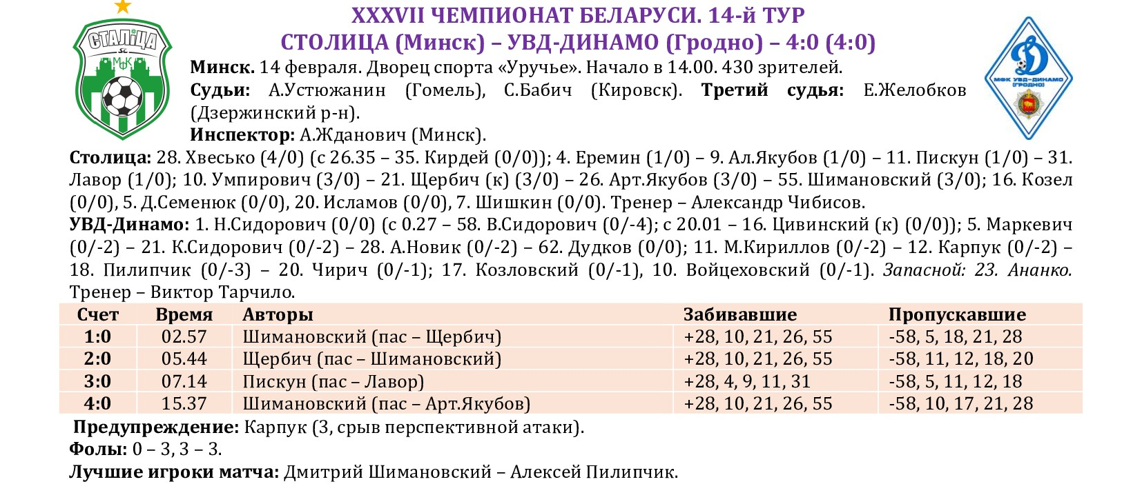 По традиции на сайте МФК «Столица» мы подводим итоги прошедшего тура с полной статистикой всех матчей, где указаны не только ассистенты при голевых «выстрелах», но и показатели по системе «плюс/минус» (статистический показатель полезности игрока, который отражает разность забитых и пропущенных командой мячей в то время, когда тот или иной игрок находился на площадке). Турнирная таблица, списки лучших бомбардиров, снайперов и самых полезных, символическая сборная, лучший игрок тура, ссылки на видеотрансляции, 10-ка самых красивых голов, выпуски телепрограмм «Ясно о мини-футболе» и «Пятый полевой» – вся информация о минувшем туре под одним заголовком!