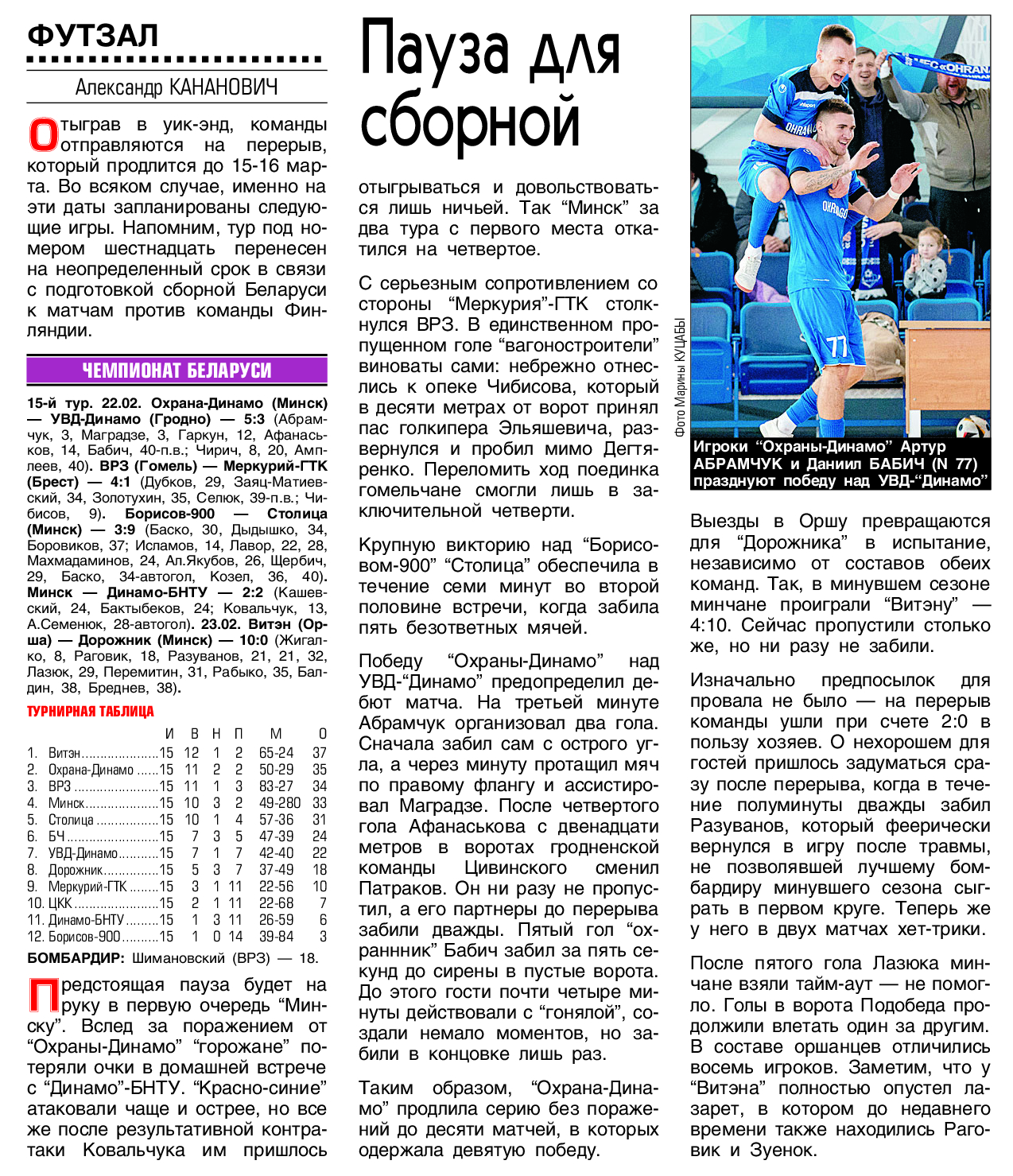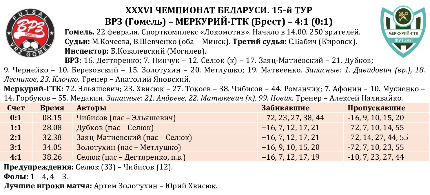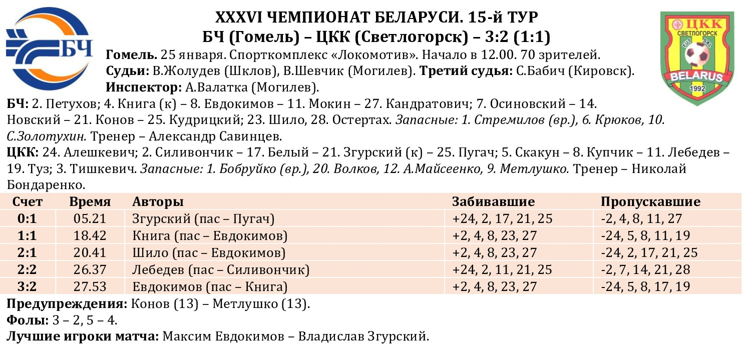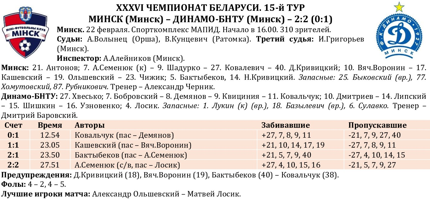 Продолжаем подводить статистические итоги прошедших туров чемпионата страны. На сайте МФК «Столица» публикуем полную статистику состоявшихся матчей 15-го тура с указанием авторов голевых передач и показателей «плюс/минус», видеообзоры, а также турнирную таблицу, символическую сборную, лучшего игрока, список лидеров среди бомбардиров, снайперов («гол + пас»), лучших по системе «плюс/минус», материалы прессы, подборку лучших голов тура, свежий выпуск «Ясно о мини-футболе». Вся информация о прошедшем туре собрана под одним заголовком в одном месте!