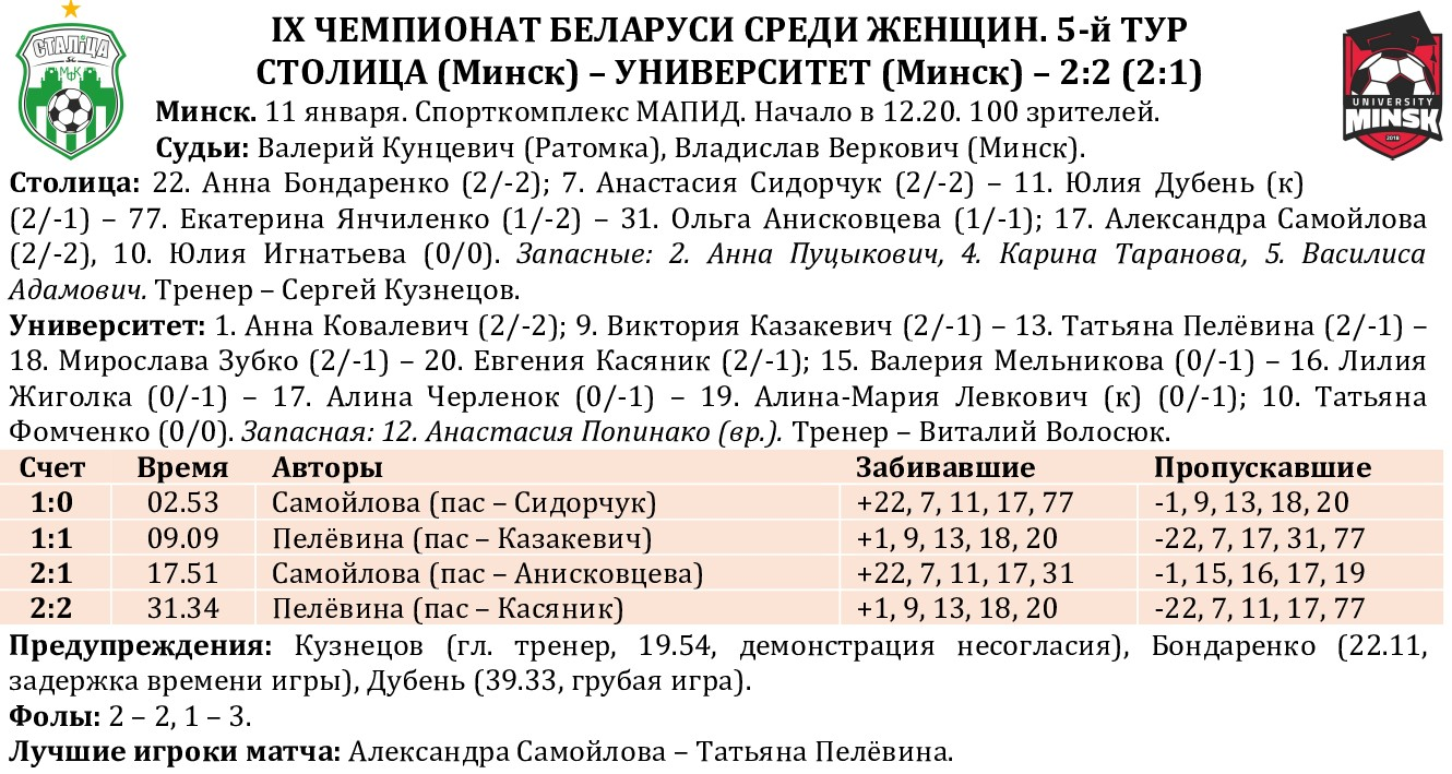 Результаты остальных матчей 5-го тура: 11.01. ГрГУ им. Я.Купалы – Вортекс – 2:5 (1:2) (Тесто, 17, 29; Белая, 6, 36, Крылова, 7, 39, Харитончик, 28-с/в). 13.01. БГУФК – ПолесГУ – 7:2 (3:0) (Соколович, 8, Тихомирова, 11, 21, Натеткова, 13, Годинская, 26, Ващук, 26, 33; Чухольская, 22, Хандога, 22).