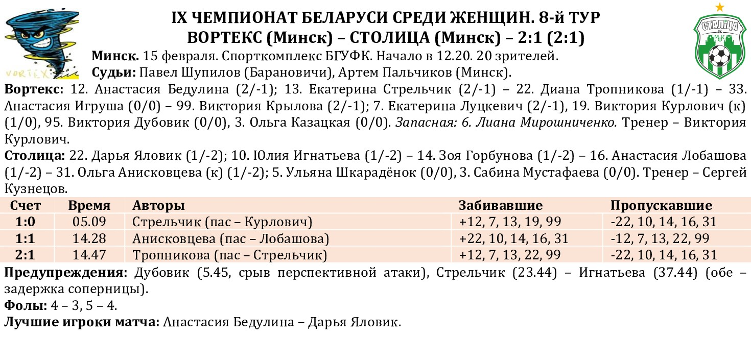 Результаты остальных матчей 8-го тура: 15.02. ГрГУ им. Я.Купалы – ПолесГУ – 7:2 (6:2) (Снитко, 3, 15, Харитончик, 3, Вайнилович, 7, Тесто, 14, 37, Парфинович, 19; Серкевич, 6, Чухольская, 12). Университет – БГУФК – 17:0 (7:0) (Гирос, 3, Зубко, 5, 18, 27, 38, Левкович, 8, 24, Пелёвина, 12, 28, 33, Касяник, 14, Мельникова, 18, Пашковская, 24, Морозова, 36, Фомченко, 37, Бенкевич, 38, Леонард, 38-с/в).