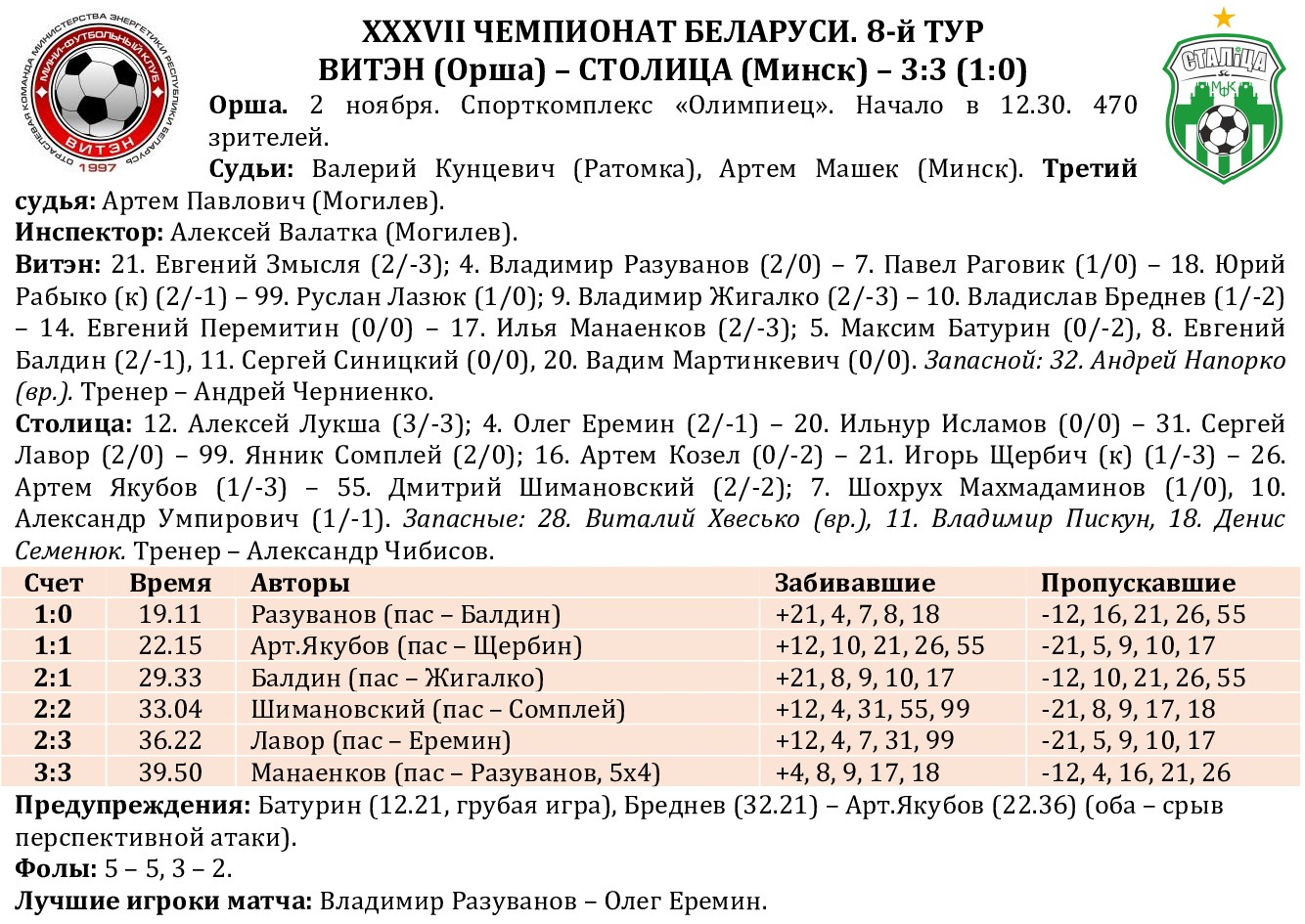 Две сильнейшие команды нашего чемпионата выдали в Орше просто потрясающий матч и по содержанию, и по накалу, и по интриге. Это матч стал 50-м «классико» в истории и сохранил полный паритет во взаимоотношениях: у обоих клубов по 20 викторий. Хотя «столичники» на этот раз были ближе к победе, до которой им не хватило всего 10 секунд. До перерыва соперники сумели отличиться всего однажды, хотя штанга и перекладина после ударов Сергея Лавора и Ильнура Исламова отзвенели прилично. А забили «энергетики» на исходе первого тайма. Владимир Разуванов с острого угла сумел точно пробить в цель. Переполненная арена взорвалась овациями. Но в дебюте второй половины «столичники» отыгрались. Игорь Щербич быстро ввел мяч из аута, и Якубов-старший (младший из-за травмы не играл) протолкнул мяч мимо голкипера хозяев. Хозяева апеллировали, что якобы до этого Щербич нарушил правила в борьбе с Владиславом Бредневым, но арбитр находился рядом и свистка не дал. В середине тайма «Витэн» снова вышел вперед: гости не заблокировали 8-го номера оршанцев, и Евгений Балдин с носка точно пробил со средней дистанции. Затем настал черед забивать «айтишникам». Сначала Дмитрий Шимановский мощнейшим ударом пробил мячом руки голкипера «Витэна», а затем Сергей Лавор на дальней штанге подкараулил прострел Олега Еремина. В концовке хозяева пошли ва-банк, заменив вратаря пятым полевым игроком. Дважды футболисты «Столицы» имели шансы поразить пустые ворота, не попали, а за считанные мгновения до сирены цели достиг точный выстрел Ильи Манаенкова, забивающего во всех матчах чемпионата. Гроссмейстерская ничья, которая поменяла команды на вершине турнирной таблицы. Благодаря лучшей разности забитых и пропущенных мячей «Витэн» сейчас первый, «Столица» – вторая. Но оршанцам еще предстоят непростые поединки и с «Охраной», и с БЧ, и с ВРЗ, которых наша команда уже благополучно прошла. В грядущие выходные – пауза в чемпионате, пройдет 1/16 финала Кубка, которую четыре лучших клуба по итогам минувшего первенства пропускают. А потом – домашний поединок с лидским «ФСК-Бутикавто», в котором раззабивался Артем Байгот, вышедший в лидеры по числу голевых залпов.