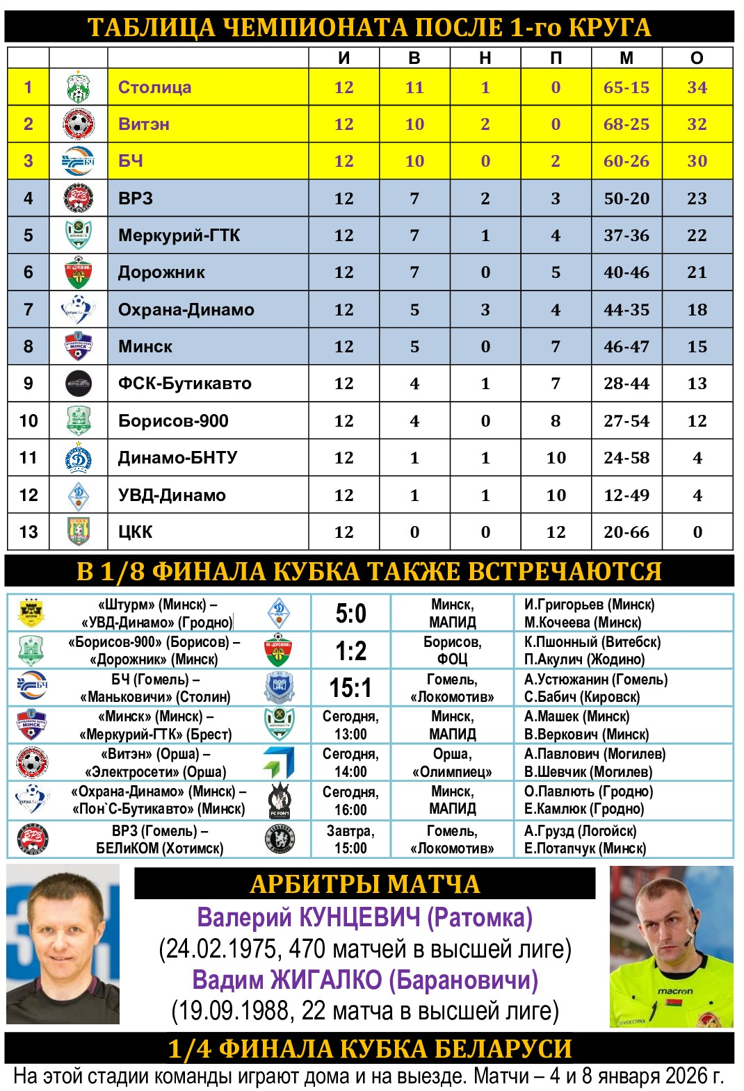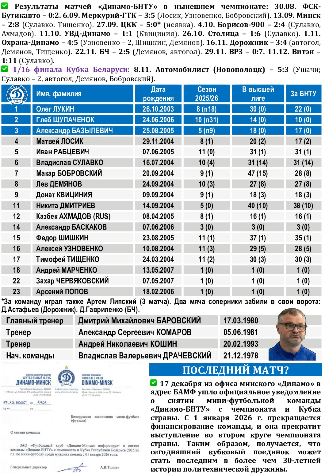 Чемпионат страны взял паузу до середины февраля. Сборная Беларуси провела два товарищеских матча в Словакии с местной командой (3:3 и 1:2), начались кубковые баталии. Согласно рейтингу, «Столица» стартовый этап Кубка пропустила, начав сразу с 1/8 финала, где волей жребия ей достались земляки из «Динамо-БНТУ». Руководство динамовского клуба официально известило Ассоциацию мини-футбола, что с 1 января 2026 года прекращается финансирование мини-футбольной команды, и та снимается с чемпионата и розыгрыша Кубка. Таким образом, матч против «Столицы», если не произойдет новогоднего чуда, может стать последним для дружины Дмитрия Баровского. Получается, что кузница молодых кадров прекратит свою работу? Большинство футболистов уже даже определились с новыми адресами продолжения карьеры, хотя для них на данном этапе важнее было бы еще годик «повариться» в своем молодежном кругу, набраться опыта, чтобы побороться затем с уже состоявшимися игрока за «место под солнцем». И есть какое-то нехорошее предчувствие, что это, возможно, не единственная зимняя потеря в высшей лиге. Хотя очень бы хотелось верить в лучшее. Приглашаем всех в субботу, 27 декабря, во Дворец спорта «Уручье» на кубковый матч «Столицы» и «Динамо-БНТУ». Матч будет показан в прямом эфире на телеканале «ЯСНАе TV» и начнется в 15.00. Да, и сможем снова увидеть на площадке Янника Сомплея. Проанонсированный его уход из «Столицы» отменяется! Ивуариец продолжит выступления в составе нашего клуба!