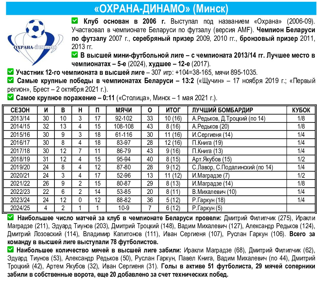 В чемпионате Беларуси среди команд высшей лиги минские «Столица» и «Охрана-Динамо» провели 22 встречи. «Столица» имеет весьма внушительный перевес, победив в 20 из них. Лишь в одном (самом первом, сыгранном 1 декабря 2013 года в спорткомплексе «Динамо») выиграли «охранники», и еще одна игра (четвертая по счету – 28 января 2015 года на МАПИДе) завершилась ничейным результатом. А затем в 18 (!) матчах подряд победа остается за «Столицей». Причем она побеждала во всех 11 (!) домашних поединках. Разность забитых и пропущенных мячей 115-33 в пользу нашего клуба.
