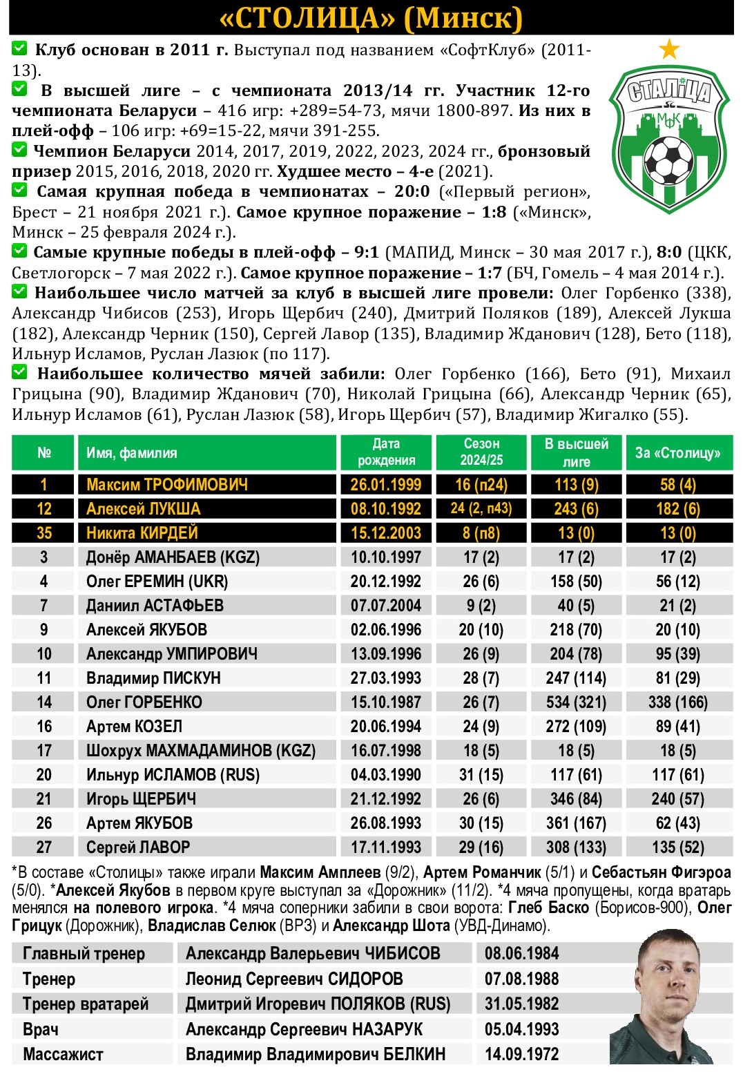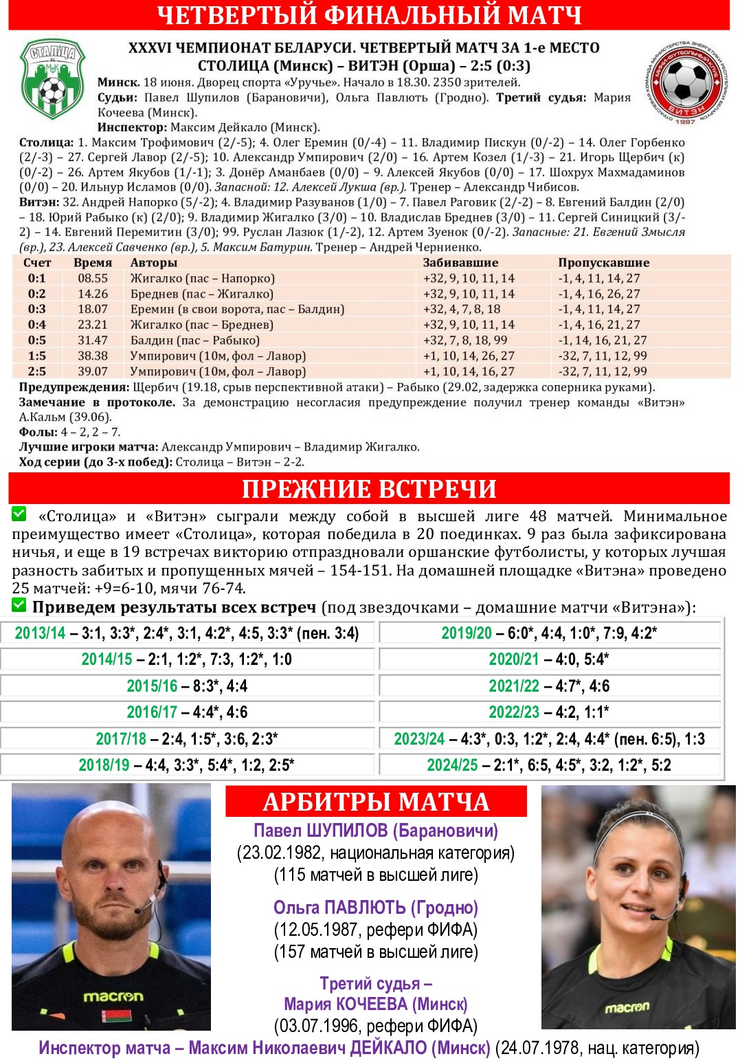 Последний бой – он трудный самый! 21 июня в Орше официально завершается XXXVI чемпионат страны. Интрига держится до самого последнего поединка. Кто станет победителем первенства и получит право представлять страну на международной арене в Лиге чемпионов? «Витэн» или «Столица»? Команды на двоих имеют 11 чемпионских титулов. «Столица» может завоевать 7-й трофей и стать единоличным лидером по числу завоеванных первых мест (сейчас 6 также имеет «Дорожник»). Или же их «Витэн» догонит и воцарится триумвират? На все вопросы ответ даст только Его Величество Игра, которая пройдет в субботу, 21 июня, в оршанском спорткомплексе «Олимпиец» и начнется в 16.00. Наверно, лишним будет напоминание, что все билеты на арену, официально имеющую 350 посадочных мест, были проданы за считанные минуты. И пусть в Орше по прогнозу ожидается дождливая погода с температурой +18, на площадке, уверены, будет жара. На стороне «Витэна» фактор домашней площадки, поддержка болельщиков и психологическое преимущество после уверенной виктории в Минске. «Столица» же жаждет сатисфакции за поражение 3-дневной давности. Александр Чибисов в одном из интервью признался, что его команда лучше играет на выезде, о чем свидетельствует и статистика: в нынешней серии за «золото» побеждали исключительно гости. За «столичников» сыграет и колоссальный опыт выхода из тяжких ситуаций: трижды кряду в чемпионатах после введения плей-офф не побеждал никто, а тут заход на четвертый круг. Не сможет помочь своим партнерам капитан минчан Игорь Щербич, заработавший дисквалификацию за перебор желтых карточек. Пока неясно, сможет ли сыграть пропускавший матч в Минске из-за травмы голкипер Алексей Лукша. Проблем хватает, а когда их не было?! «Столица» тем и сильна! На берега Днепра поболеть за нее собирается внушительный болельщицкий десант. «Столица»! Ты никогда не останешься одна! Верим в команду!