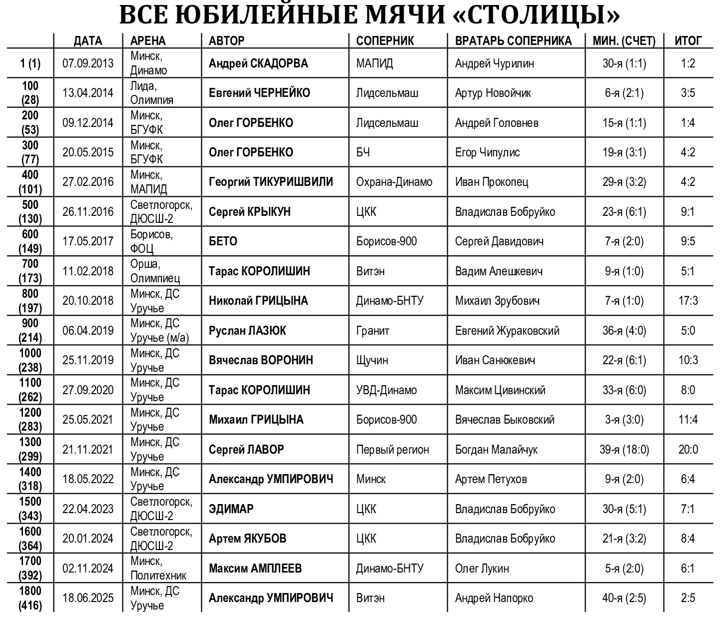 «Столица» забила свой 1800-й мяч в высшей лиге. Напомним авторов юбилейных голов (в скобках указан номер матча в элитном дивизионе):