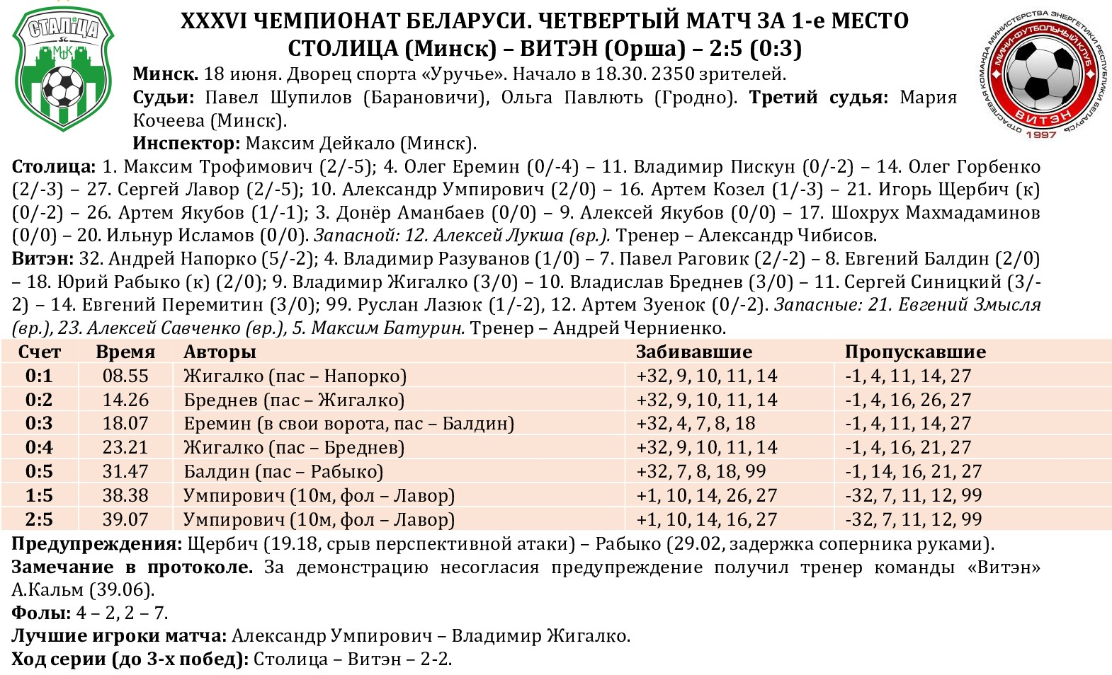 За 1-е место (до 3-х побед). Пятый матч. 21.06. Витэн – Столица (Орша, Олимпиец, 16.00).
