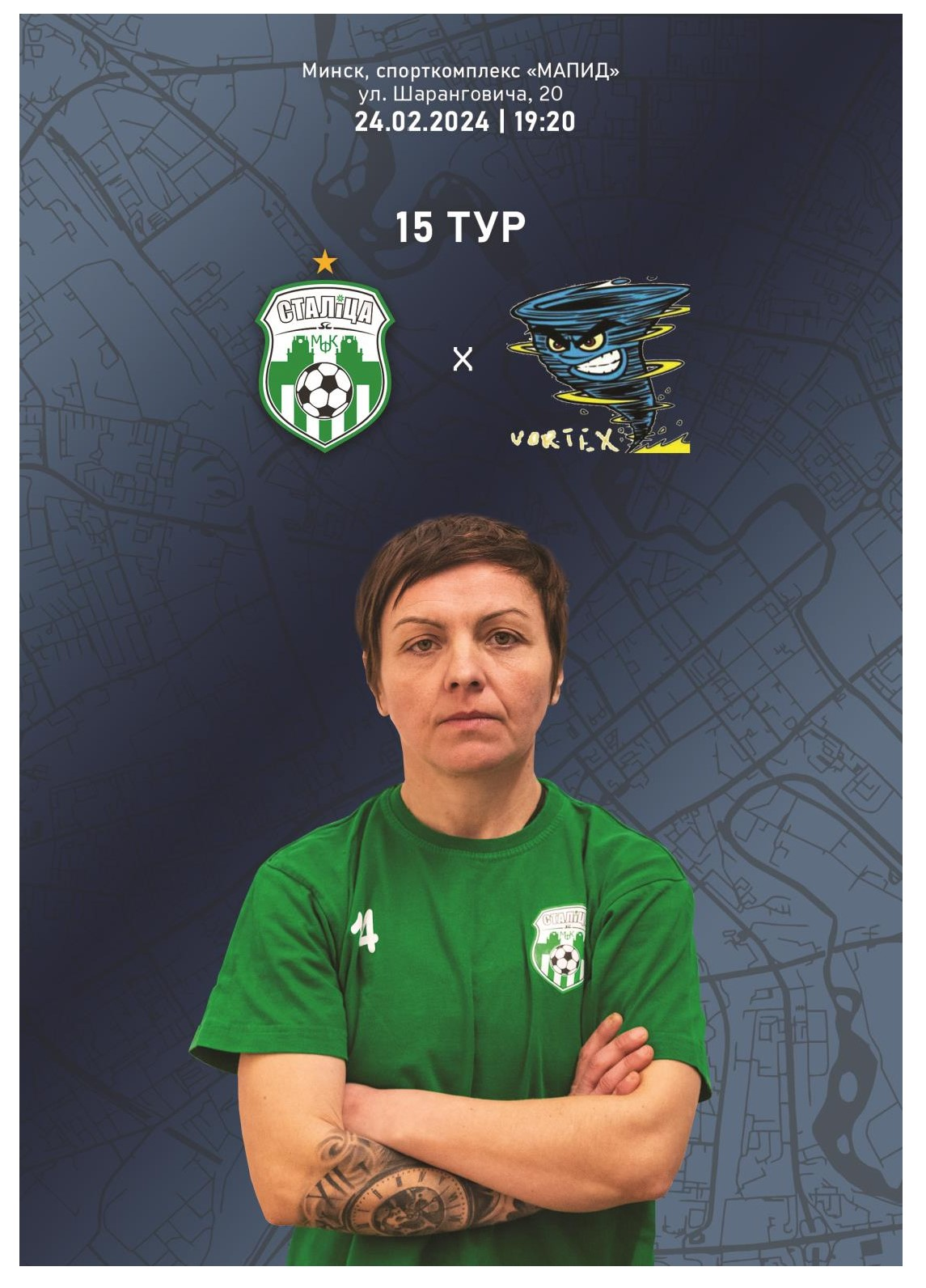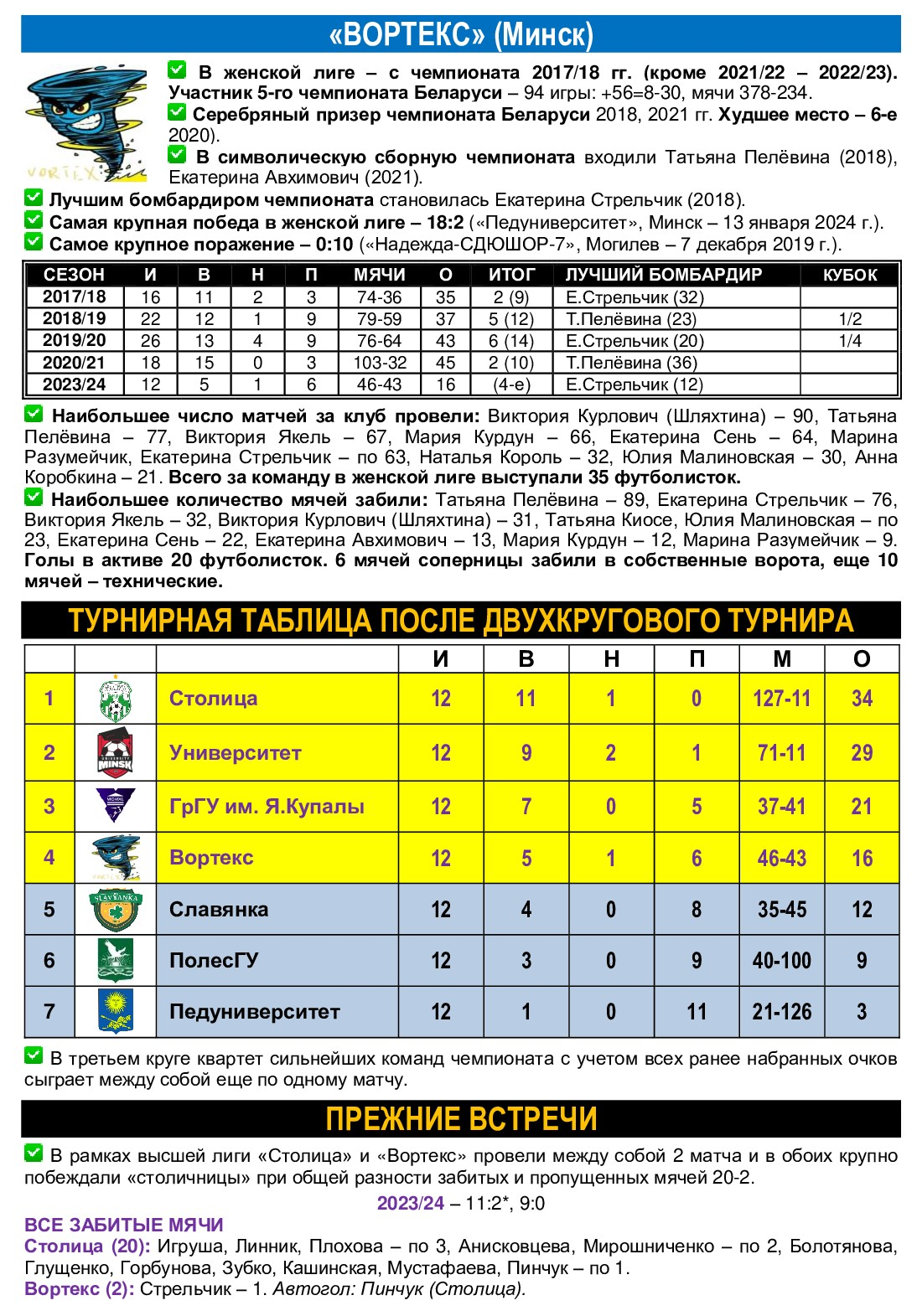 23.12.2023. Столица – Вортекс – 11:2 (6:1) (Линник, 4, 15, 20, Плохова, 4, 31, Игруша, 6, 7, Болотянова, 28, Зубко, 34, Пинчук, 37, Мирошниченко, 40; Пинчук, 2-с/в, Стрельчик, 40).