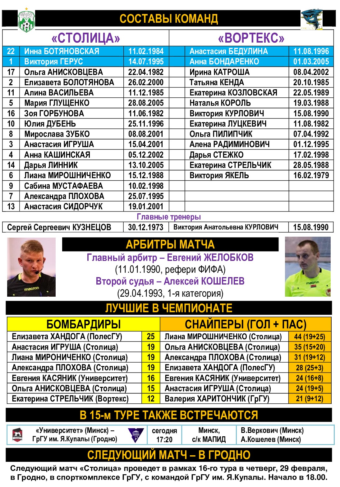 В другом матче 15-го тура также встречаются: 24.02. Университет – ГрГУ им. Я.Купалы (Минск, МАПИД, 17.20). 16-й тур. 25.02. Вортекс – Университет (МАПИД, 12.20).