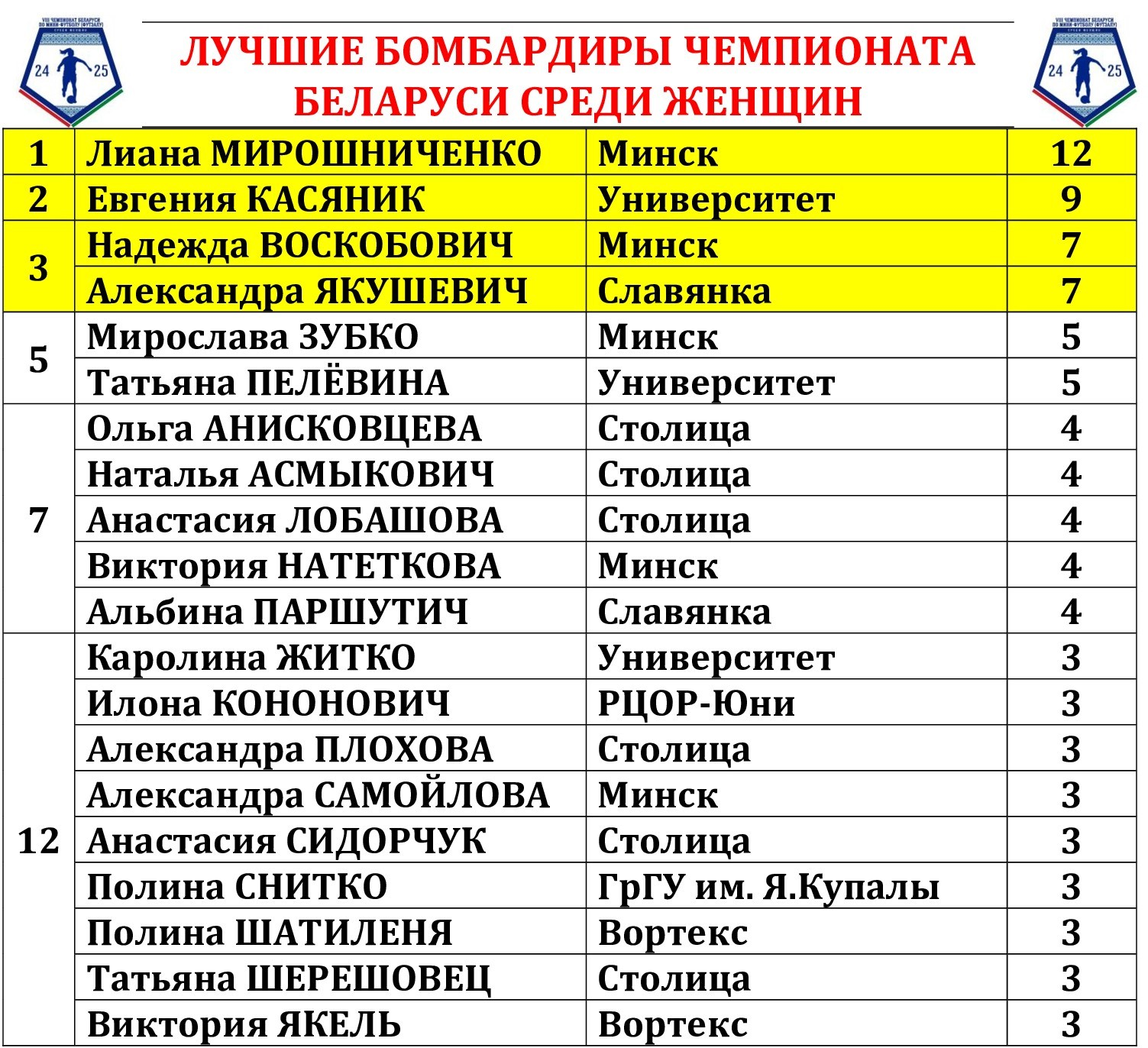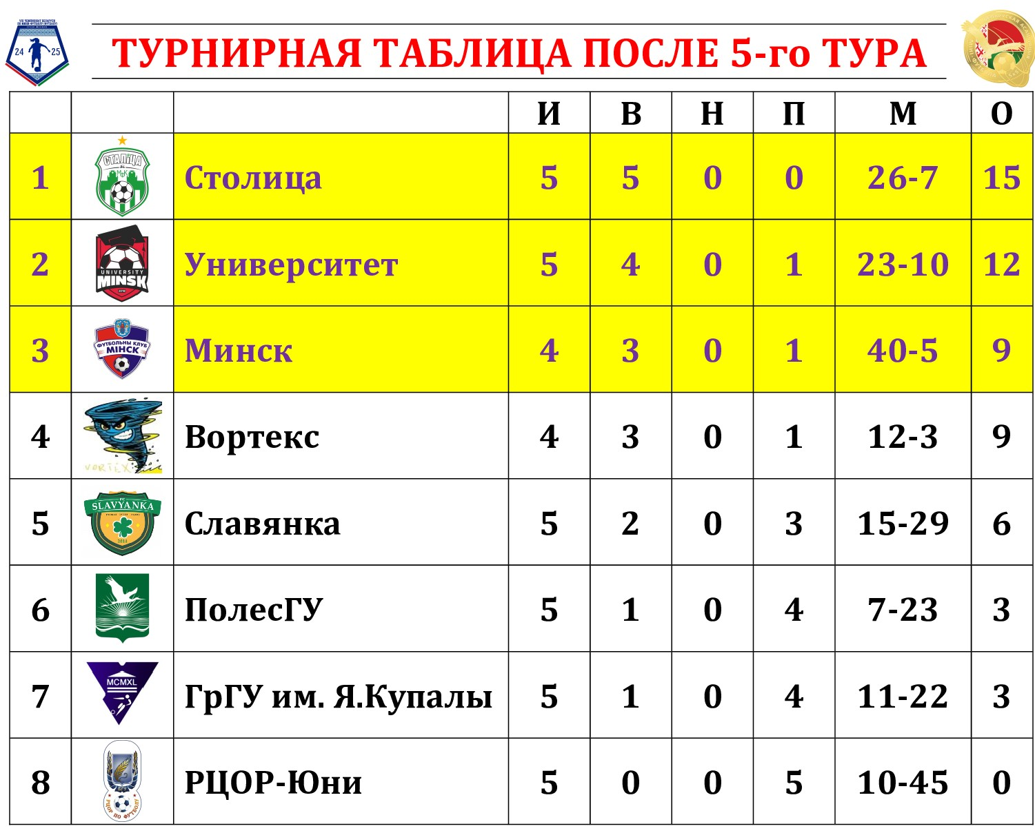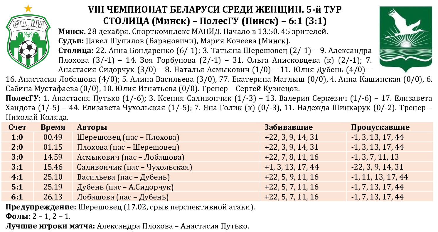 Результаты остальных матчей 5-го тура: 28.12. Вортекс – ГрГУ им. Я.Купалы – 4:0 (1:0) (Шатиленя, 7, Стрельчик, 24, Катроша, 26, Король, 34). Минск – Славянка – 13:0 (6:0) (Годинская, 4, Куприянчик, 5, 23, Воскобович, 12, 13, Е.Сорокач, 14-с/в, Мирошниченко, 17, 26, 28, 33, Натеткова, 30, Киянка, 30, Белая, 32). 29.12. Университет – РЦОР-Юни – 4:0 (3:0) (Юшко, 11, Касяник, 18, 20, Мельникова, 22).