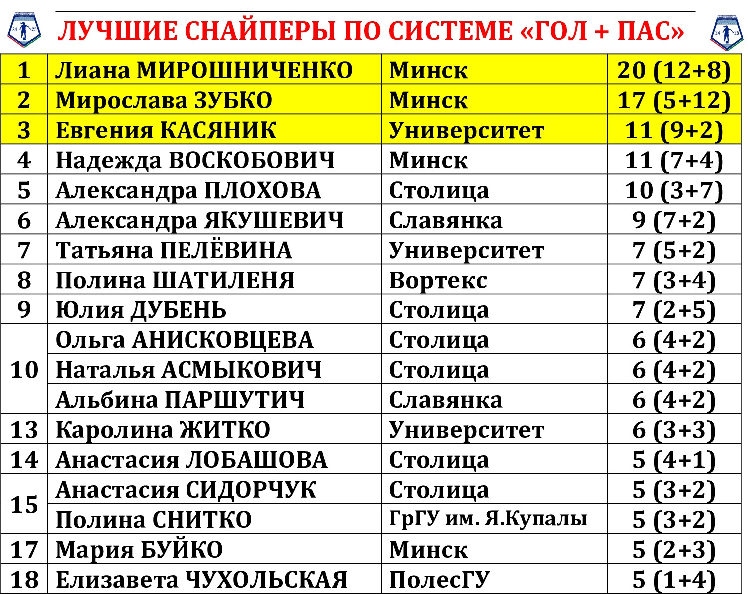 В чемпионате Беларуси среди женщин пауз не предвидится. Отыграли тур перед Новым годом, и уже 4 января снова придется выходить на площадку. «Столица» закрыла календарный год без поражений, в роли единоличного лидера. В первом круге предстоит сыграть еще два поединка: со «Славянкой» и гродненским ГрГУ. А в минувшую субботу был обыгран пинский ПолесГУ – 6:1. «Столичницы» «выстрелили» двумя результативными залпами. Сначала первый квартет дважды отличился в течении 26 секунд, а после перерыва вторая четверка за смену забила трижды, причем четвертый и пятый голы разделили всего 9 (!) мгновений. Теперь на очереди – «Славянка». Суббота, 4 января, спорткомплекс МАПИД, начало в 13.20.