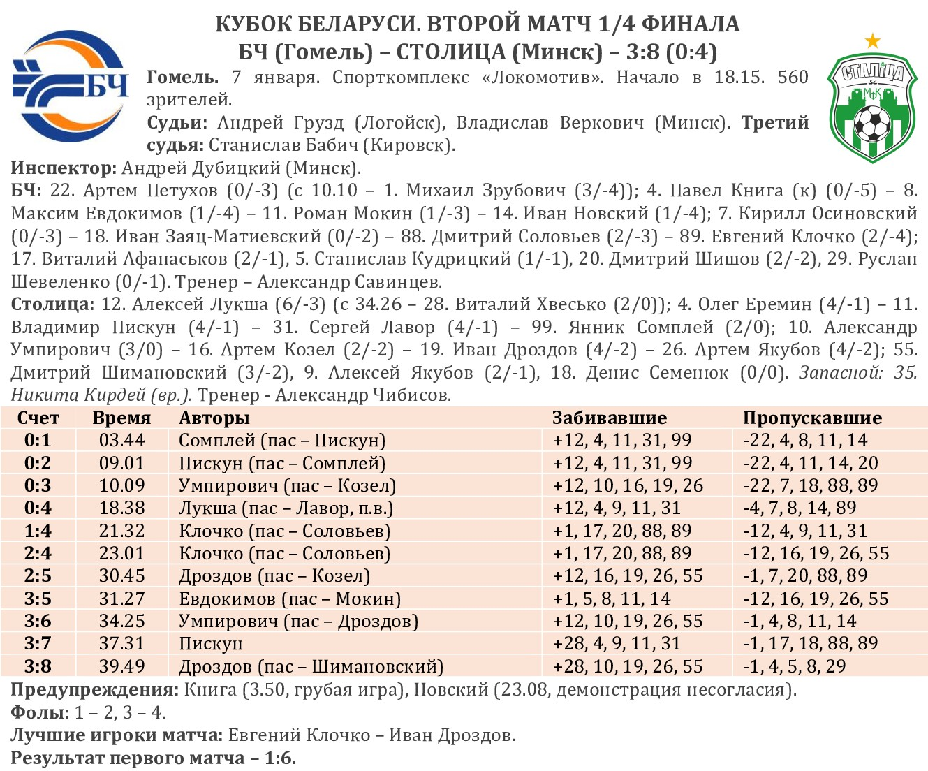 Результаты остальных вторых матчей 1/4 финала. 7.01. Охрана-Динамо – Меркурий-ГТК – 3:3 (3:1) (Хомутовский, 17, Гаркун, 19, Барсуков, 20; Осипов, 1, Матицын, 34, 40). Штурм – Витэн – 3:9 (0:6) (Плечистик, 33, Рогов, 36, Матарас, 39; Балдин, 2, Разуванов, 2, Перемитин, 8, Батурин, 9, 15, 30, Мартинкевич, 18, Жигалко, 27, Напорко, 35). Дорожник – ВРЗ – 2:4 (1:1) (Новик, 5, Осмоловский, 40; Лось, 1, Кузьма, 31, Березовский, 34, Чернейко, 40).