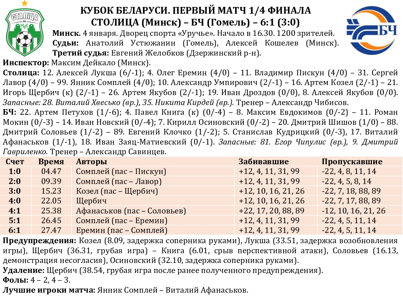 Перед четвертьфинальным этапом пара «Столица» – БЧ считалась самой ровной, и не зря телевизионщики выбрали оба матча с участием этих команд для показа на «Беларусь 5». Комментировавший матч из «Уручья» Илья Бакай после воскресной игры скажет: «Неплохая встреча, но… без интриги». И действительно, надежды на упорную борьбу не оправдались. Настолько здорово сыграла «Столица»! А ведь в ее составе отсутствовал затемпературивший основной бомбардир Дмитрий Шимановский. Но чем сильна в последние годы «Столица» – это взаимозаменяемостью. Сделав необходимые перестановки, главком «столичников» Александр Чибисов не прогадал. Особенно хорош был хотевший уехать, но из-за форс-мажорных обстоятельств оставшийся в Минске ивуариец Янник Сомплей. Его первый хет-трик в составе «Столицы» удался на славу. Сначала он технично, пяточкой, переправил мяч в сетку после удара Пискуна, затем, получив передачу на позиции «столба», развернул Кудрицкого и неотразимо пробил, ну а третий гол получился после неразберихи в рядах БЧ, рикошета от Еремина и точного выстрела. А самым красивым признаем мяч Олега Еремина, установившего окончательный счет. На правой бровке украинец элегантно обыграл Книгу (тот в сердцах махнул рукой и пошел меняться), протянул мяч вперед и с левой ноги зарядил в дальний угол гомельских ворот. Эффектнейший гол!