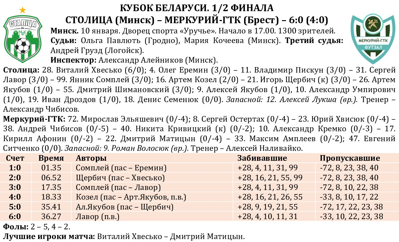 Всё по плану. В полуфинальном матче XXXVI Кубка страны «Столица» уверенно победила брестский «Меркурий-ГТК» и завоевала путевку в финал, где в воскресенье сыграет с оршанским «Витэном». Дружина Александра Чибисова по уже сложившейся традиции «отгрузила» 6 мячей «таможенникам» (помните, что счет 6:1 в противостоянии с ними является приоритетным!), не пропустила благодаря надежным действиям обороны и молодого голкипера Виталия Хвесько (он еще и голевую передачу записал на свой счет), предоставив игровую практику всем без исключения полевым игрокам, дав лидерам после перерыва возможность передохнуть и уже готовиться мыслями к завтрашней встрече. Снова отметим безусловный вклад в победу ивуарийца Янника Сомплея, находящегося просто в потрясающей форме. Всего у него в активе уже 6 кубковых мячей. А вот Сергей Лавор, установивший окончательный счет, забил свой 20-й мяч за «Столицу» в Кубках и догнал по голам лидировавшего Олега Горбенко. В воскресенье есть шанс стать главным «столичным» кубковым голеадором!