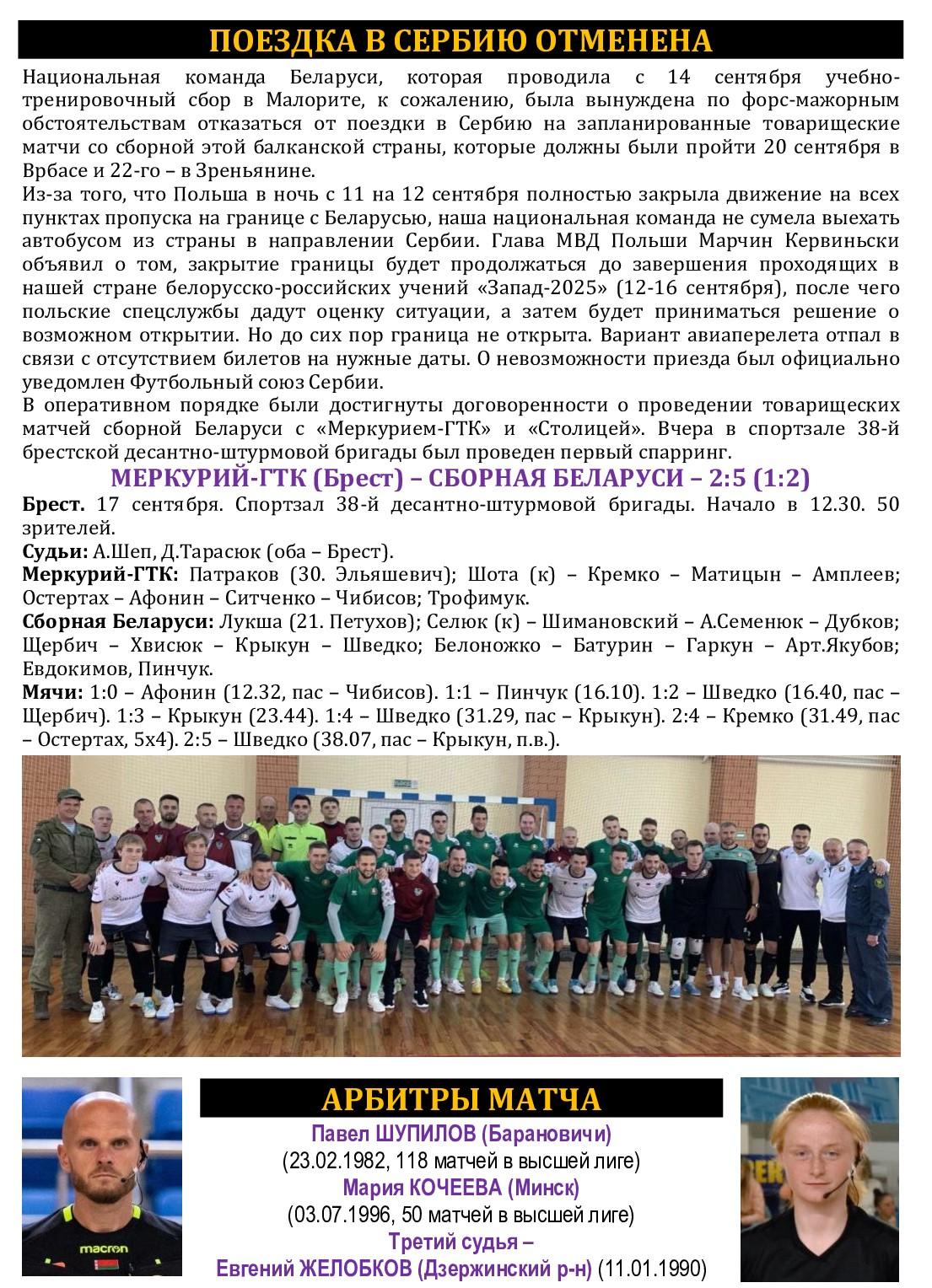 В связи с отменой поездки национальной команды Беларуси в Сербию, она завершит учебно-тренировочный сбор двумя контрольными матчами с клубами национального чемпионата. Вчера подопечные Александра Черника обыграли в Бресте местный «Меркурий-ГТК» – 5:2, а сегодня в 19.00 в минском Дворце спорта «Уручье» проведут спарринг с 6-кратным чемпионом страны – «Столицей». Вход на матч – свободный. Будет организована видеотрансляция поединка, который можно посмотреть по этой ссылке: