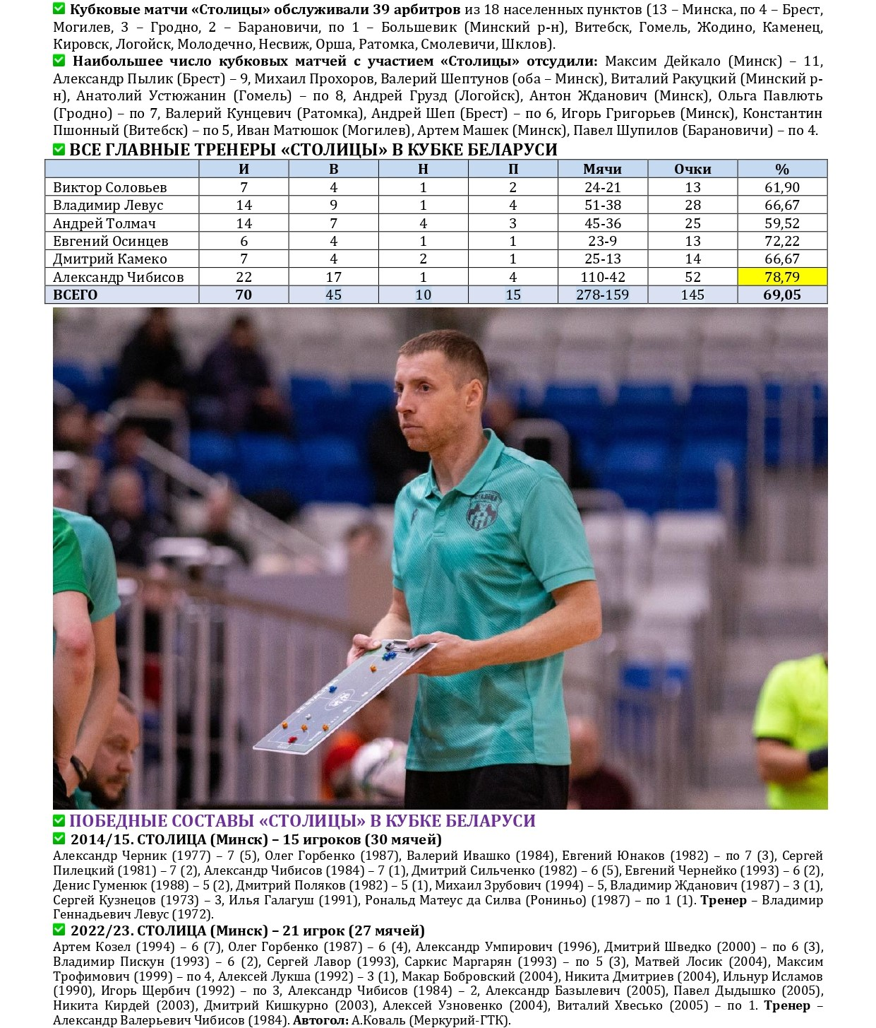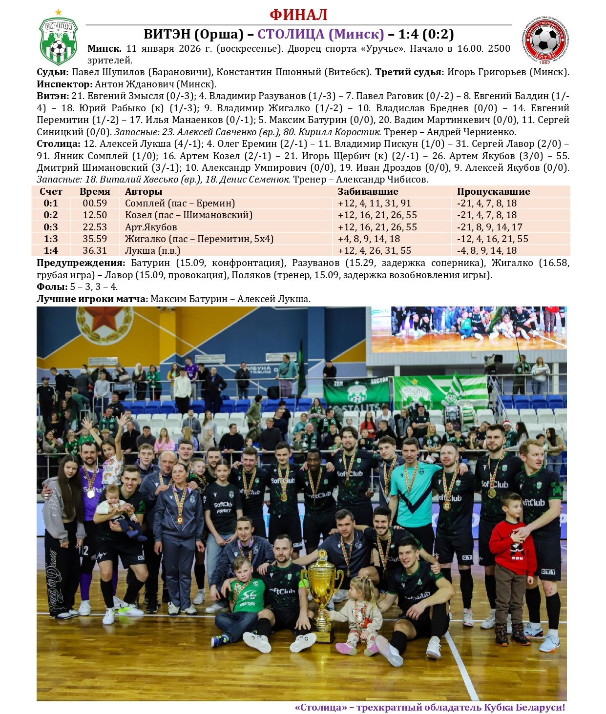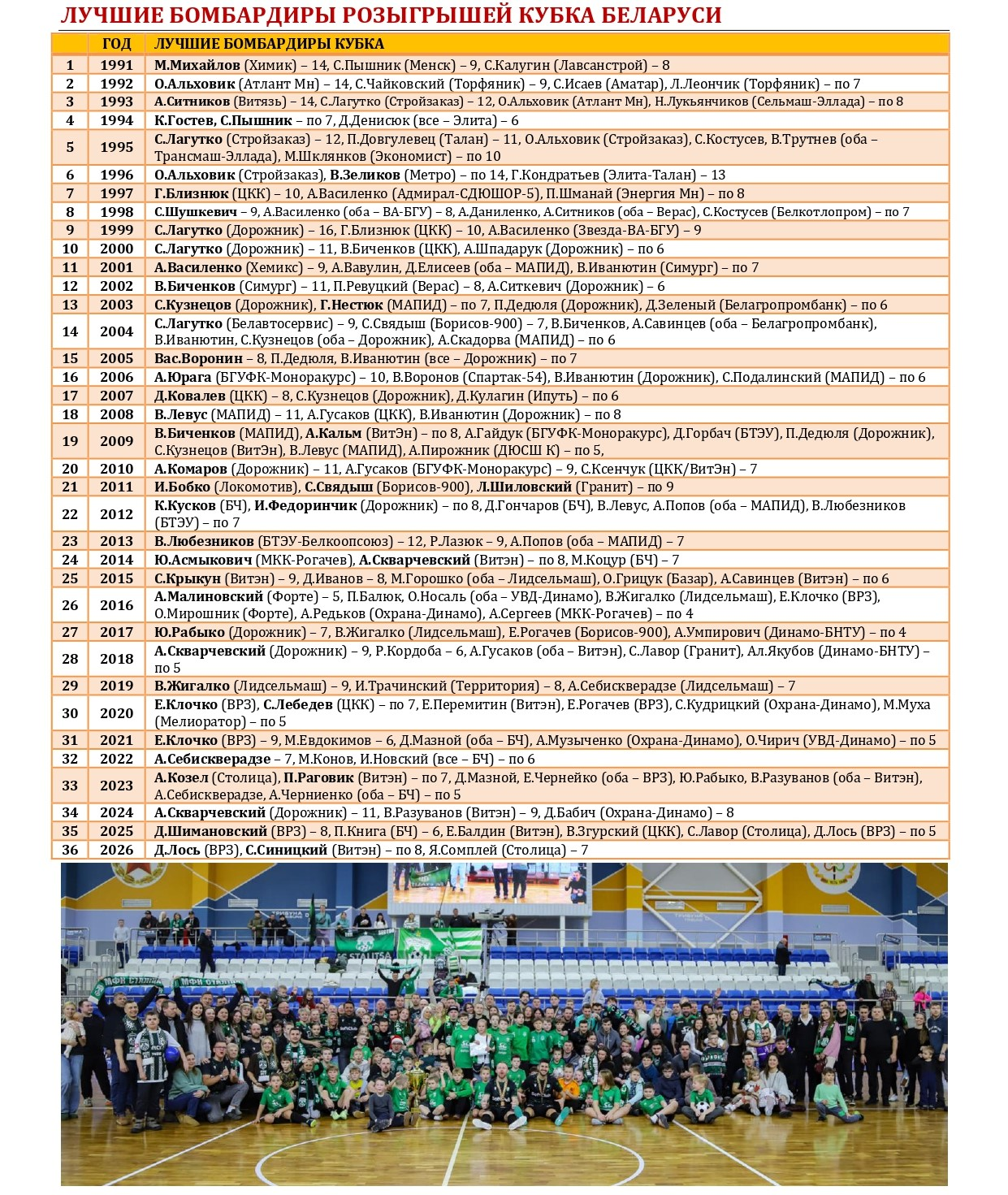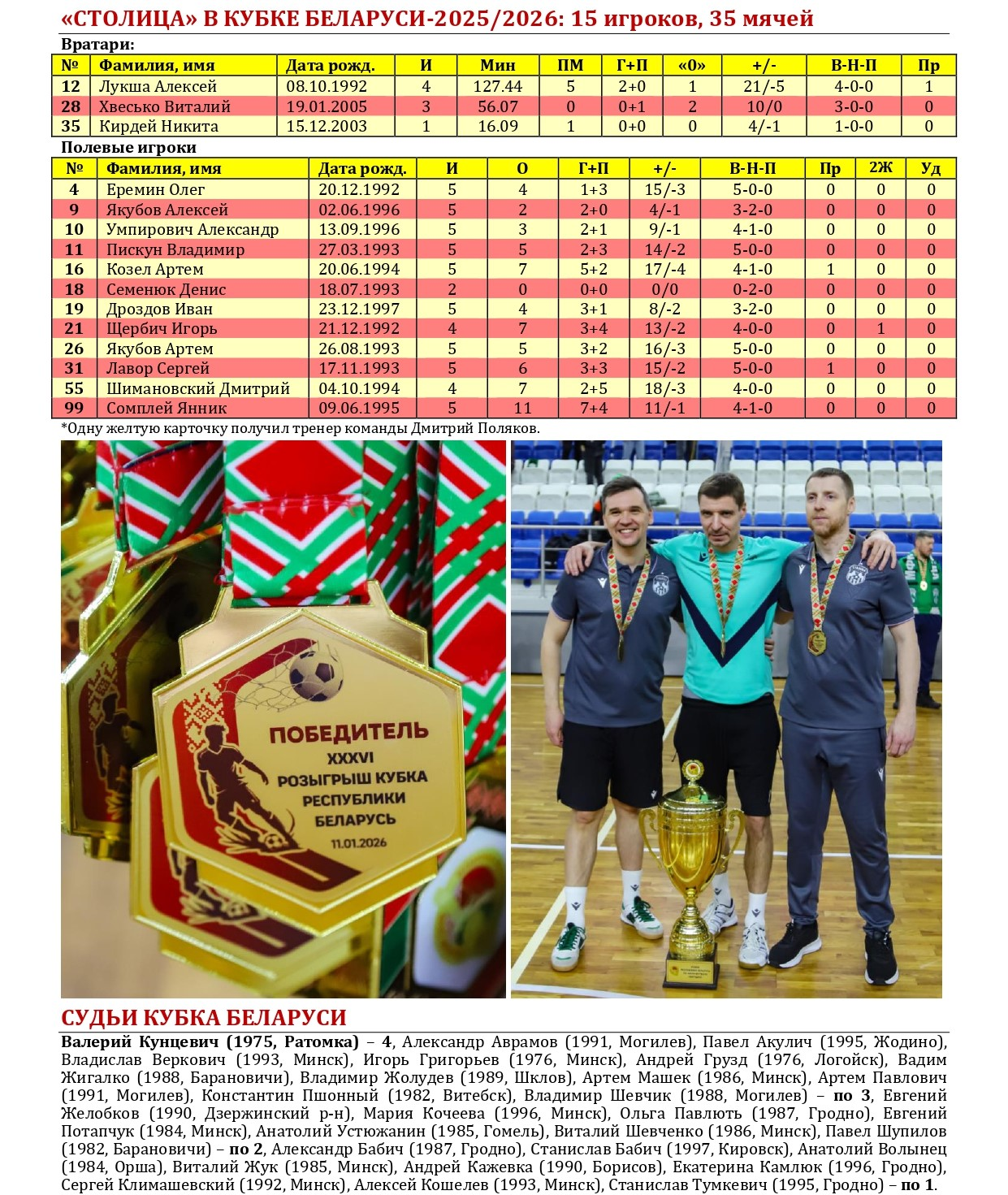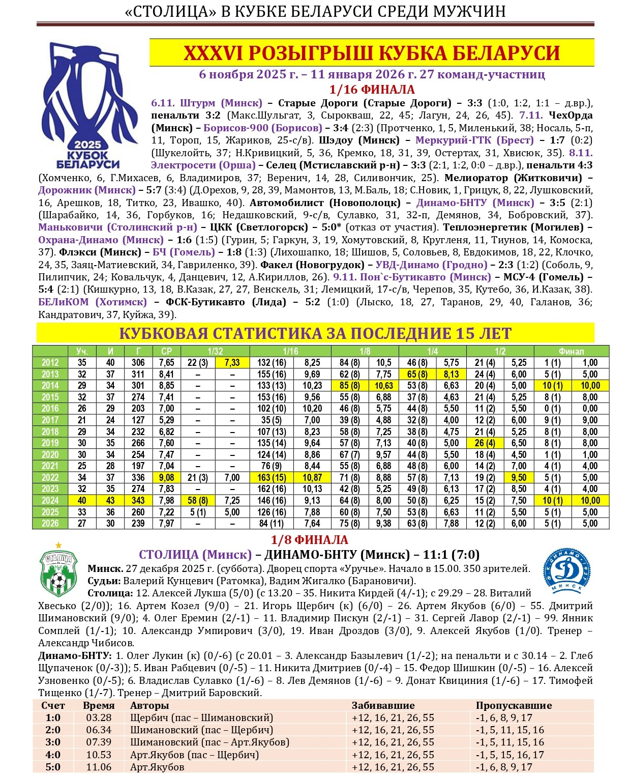Не так давно «Столица» в третий раз в своей биографии стала победительницей Кубка Беларуси по мини-футболу. Предлагаем вашему вниманию большой статистический материал, посвященный итогам XXXVI розыгрыша Кубка с акцентом на выступления в нем нашей команды, а также подведем итоги 15-летней истории «дружбы» «Столицы» с этим турниром. Раскладка результатов по сезонам, лучшие бомбардиры, «долгожители», все соперники, города и судьи. Читаем и анализируем!